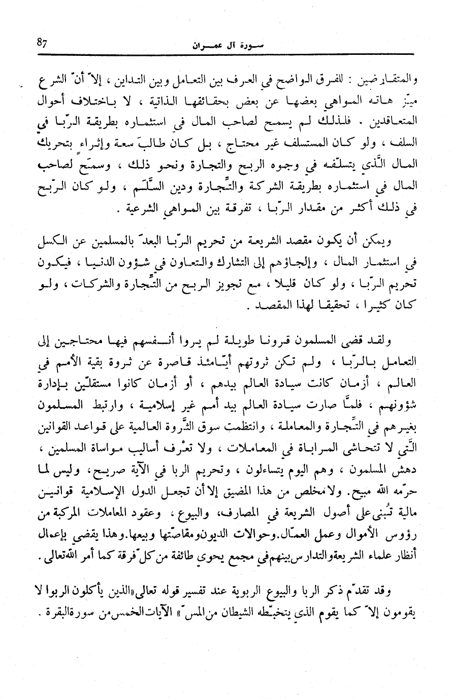 وَلَقَدْ قَضَى الْمُسْلِمُونَ قُرُونًا طَوِيلَةً لَمْ يَرَوْا أَنْفُسَهُمْ فِيهَا مُحْتَاجِينَ إِلَى التَّعَامُلِ بِالرِّبَا، وَلَمْ تَكُنْ ثَرْوَتُهُمْ أَيَّامَئِذٍ قَاصِرَةً عَنْ ثَرْوَةِ بَقِيَّةِ الْأُمَمِ فِي الْعَالَمِ، أَزْمَانَ كَانَتْ سيادة الْعَالم بيدهم، أَوْ أَزْمَانَ كَانُوا مستقلّين بإدارة شؤونهم، فَلَمَّا صَارَتْ سِيَادَةُ الْعَالَمِ بِيَدِ أُمَمٍ غَيْرِ إِسْلَامِيَّةٍ، وَارْتَبَطَ الْمُسْلِمُونَ بِغَيْرِهِمْ فِي التِّجَارَةِ وَالْمُعَامَلَةِ، وَانْتَظَمَتْ سُوقُ الثَّرْوَةِ الْعَالَمِيَّةِ عَلَى قَوَاعِدِ الْقَوَانِينِ الَّتِي لَا تَتَحَاشَى الْمُرَابَاةَ فِي الْمُعَامَلَاتِ، وَلَا تَعْرِفُ أَسَالِيبَ مُوَاسَاةِ الْمُسْلِمِينَ، دُهِشَ الْمُسْلِمُونَ، وَهُمُ الْيَوْمَ يَتَسَاءَلُونَ، وَتَحْرِيمُ الرِّبَا فِي الْآيَةِ صَرِيحٌ، وَلَيْسَ لِمَا حَرَّمَهُ اللَّهُ مُبِيحٌ. وَلَا مُخَلِّصَ من هَذَا الْمضيق إِلَّا أَنْ تَجْعَلَ الدُّوَلُ الْإِسْلَامِيَّةُ قَوَانِينَ مَالِيَّةً تُبْنَى عَلَى أُصُولِ الشَّرِيعَةِ فِي الْمَصَارِفِ، وَالْبُيُوعِ، وَعُقُودِ الْمُعَامَلَاتِ المركبة من رُؤُوس الْأَمْوَالِ وَعَمَلِ الْعُمَّالِ. وَحَوَالَاتِ الدُّيُونِ وَمُقَاصَّتِهَا وَبَيْعِهَا. وَهَذَا يَقْضِي بِإِعْمَالِ أَنْظَارِ عُلَمَاءِ الشَّرِيعَةِ وَالتَّدَارُسِ بَيْنَهُمْ فِي مَجْمَعٍ يَحْوِي طَائِفَةً مِنْ كُلِّ فُرْقَةٍ كَمَا أَمَرَ اللَّهُ تَعَالَى.