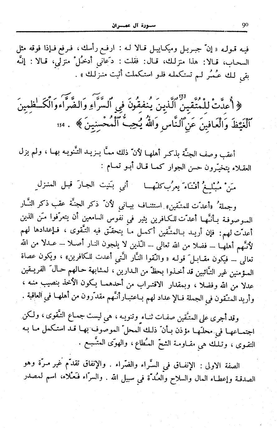 أُعِدَّتْ لِلْمُتَّقِينَ الَّذِينَ يُنْفِقُونَ فِي السَّرَّاءِ وَالضَّرَّاءِ وَالْكاظِمِينَ الْغَيْظَ وَالْعافِينَ عَنِ النَّاسِ وَاللَّهُ يُحِبُّ الْمُحْسِنِينَ (134) .