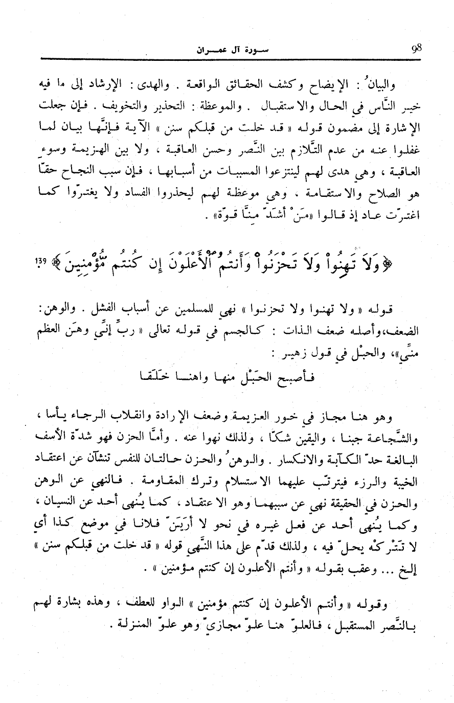 جُبْنًا، وَالْيَقِينِ شَكًّا، وَلِذَلِكَ نُهُوا عَنْهُ. وَأَمَّا الْحُزْنُ فَهُوَ شِدَّةُ الْأَسَفِ الْبَالِغَةُ حَدَّ الْكَآبَةِ وَالِانْكِسَارِ. وَالْوَهَنُ وَالْحَزَنُ حَالَتَانِ لِلنَّفْسِ تَنْشَآنِ عَنِ اعْتِقَادِ الْخَيْبَةِ وَالرُّزْءِ فَيَتَرَتَّبُ عَلَيْهِمَا الِاسْتِسْلَامُ وَتَرْكُ الْمُقَاوَمَةِ. فَالنَّهْيُ عَنِ الْوَهَنِ وَالْحُزْنِ فِي الْحَقِيقَةِ نَهْيٌ عَنْ سَبَبِهِمَا وَهُوَ الِاعْتِقَادُ، كَمَا يُنْهَى عَنِ النِّسْيَانِ، وَكَمَا يُنْهَى أَحَدٌ عَنْ فِعْلِ غَيْرِهِ فِي نَحْوِ لَا أَرَيَنَّ فُلَانًا فِي مَوْضِعِ كَذَا أَيْ لَا تَتْرُكْهُ يَحُلُّ فِيهِ، وَلِذَلِكَ قَدَّمَ عَلَى هَذَا النَّهْيِ قَوْلَهُ: قَدْ خَلَتْ مِنْ قَبْلِكُمْ سُنَنٌ [آل عمرَان: 137] إِلَخْ ... وَعَقَّبَ بِقَوْلِهِ: وَأَنْتُمُ الْأَعْلَوْنَ إِنْ كُنْتُمْ مُؤْمِنِينَ.