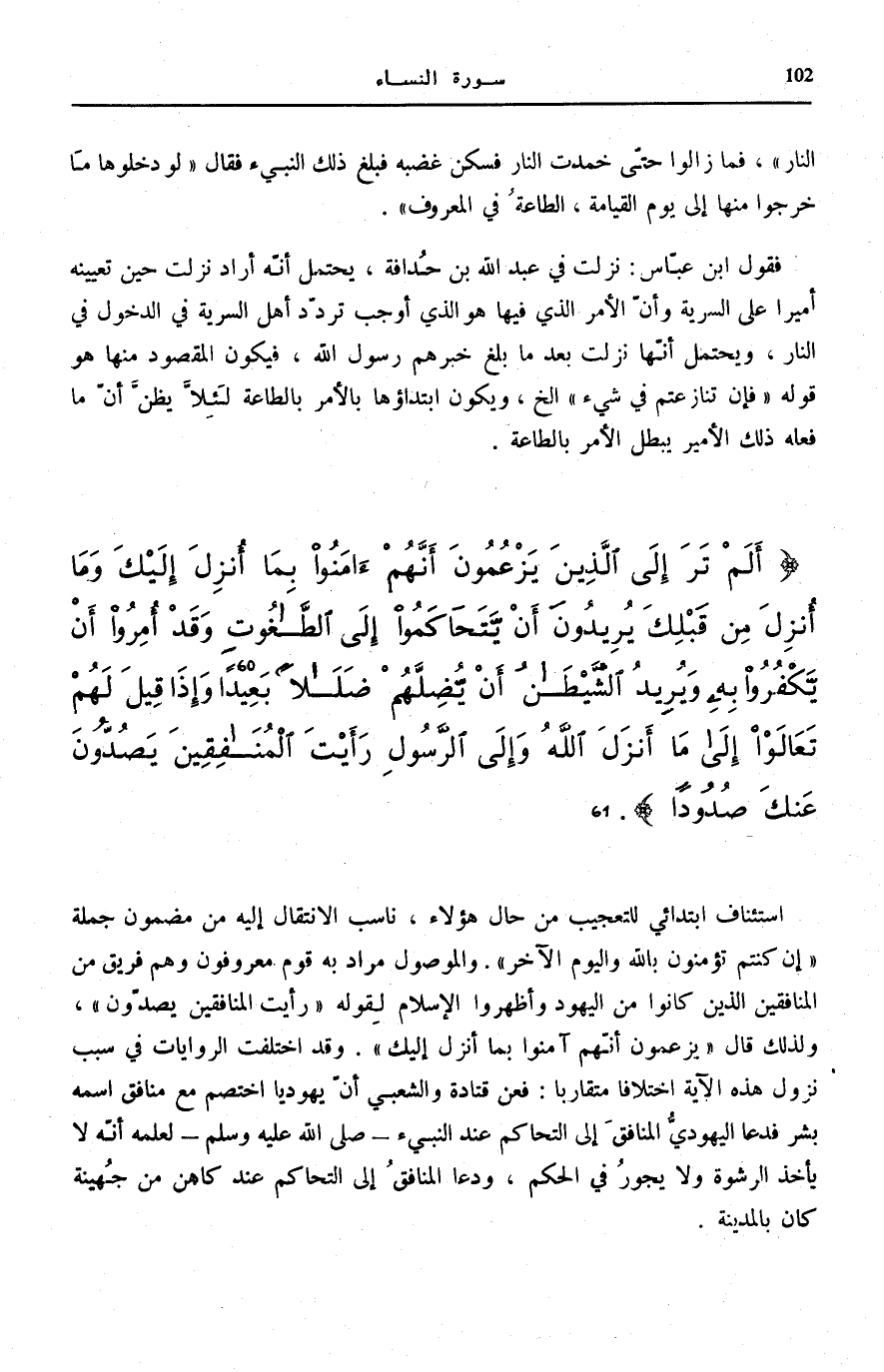 أَلَمْ تَرَ إِلَى الَّذِينَ يَزْعُمُونَ أَنَّهُمْ آمَنُوا بِما أُنْزِلَ إِلَيْكَ وَما أُنْزِلَ مِنْ قَبْلِكَ يُرِيدُونَ أَنْ يَتَحاكَمُوا إِلَى الطَّاغُوتِ وَقَدْ أُمِرُوا أَنْ يَكْفُرُوا بِهِ وَيُرِيدُ الشَّيْطانُ أَنْ يُضِلَّهُمْ ضَلالاً بَعِيداً (60) وَإِذا قِيلَ لَهُمْ تَعالَوْا إِلى مَا أَنْزَلَ اللَّهُ وَإِلَى الرَّسُولِ رَأَيْتَ الْمُنافِقِينَ يَصُدُّونَ عَنْكَ صُدُوداً (61)
