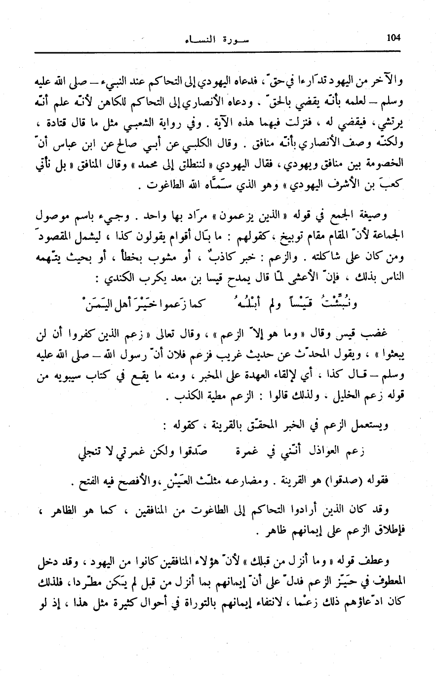 وَالْآخَرُ من الْيَهُود تدارءا فِي حَقٍّ، فَدَعَاهُ الْيَهُودِيُّ إِلَى التَّحَاكُمِ عِنْدَ النَّبِيءِ صَلَّى اللهُ عَلَيْهِ وَسَلَّمَ لِعِلْمِهِ بِأَنَّهُ يَقْضِي بِالْحَقِّ. وَدَعَاهُ الْأَنْصَارِيُّ إِلَى التَّحَاكُمِ لِلْكَاهِنِ لِأَنَّهُ عَلِمَ أَنَّهُ يَرْتَشِي، فَيَقْضِي لَهُ، فَنَزَلَتْ فِيهِمَا هَذِهِ الْآيَةُ. وَفِي رِوَايَةِ الشَّعْبِيِّ مِثْلُ مَا قَالَ قَتَادَةُ، وَلَكِنَّهُ وَصَفَ الْأَنْصَارِيَّ بِأَنَّهُ مُنَافِقٌ. وَقَالَ الْكَلْبِيُّ عَنْ أَبِي صَالِحٍ عَنِ ابْنِ عَبَّاسٍ أَنَّ الْخُصُومَةَ بَيْنَ مُنَافِقٍ وَيَهُودِيٍّ، فَقَالَ الْيَهُودِيُّ «لِنَنْطَلِقْ إِلَى مُحَمَّدٍ» وَقَالَ الْمُنَافِقُ «بَلْ نَأْتِي كَعْبَ بْنَ الْأَشْرَفِ الْيَهُودِيَّ» وَهُوَ الَّذِي سَمَّاهُ اللَّهُ الطَّاغُوتَ.