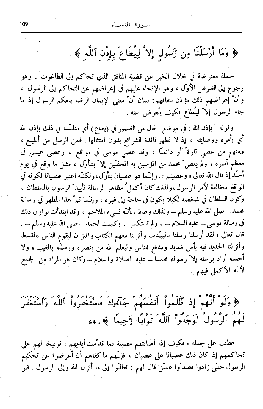 وَما أَرْسَلْنا مِنْ رَسُولٍ إِلاَّ لِيُطاعَ بِإِذْنِ اللَّهِ وَلَوْ أَنَّهُمْ إِذْ ظَلَمُوا أَنْفُسَهُمْ جاؤُكَ فَاسْتَغْفَرُوا اللَّهَ وَاسْتَغْفَرَ لَهُمُ الرَّسُولُ لَوَجَدُوا اللَّهَ تَوَّاباً رَحِيماً (64)