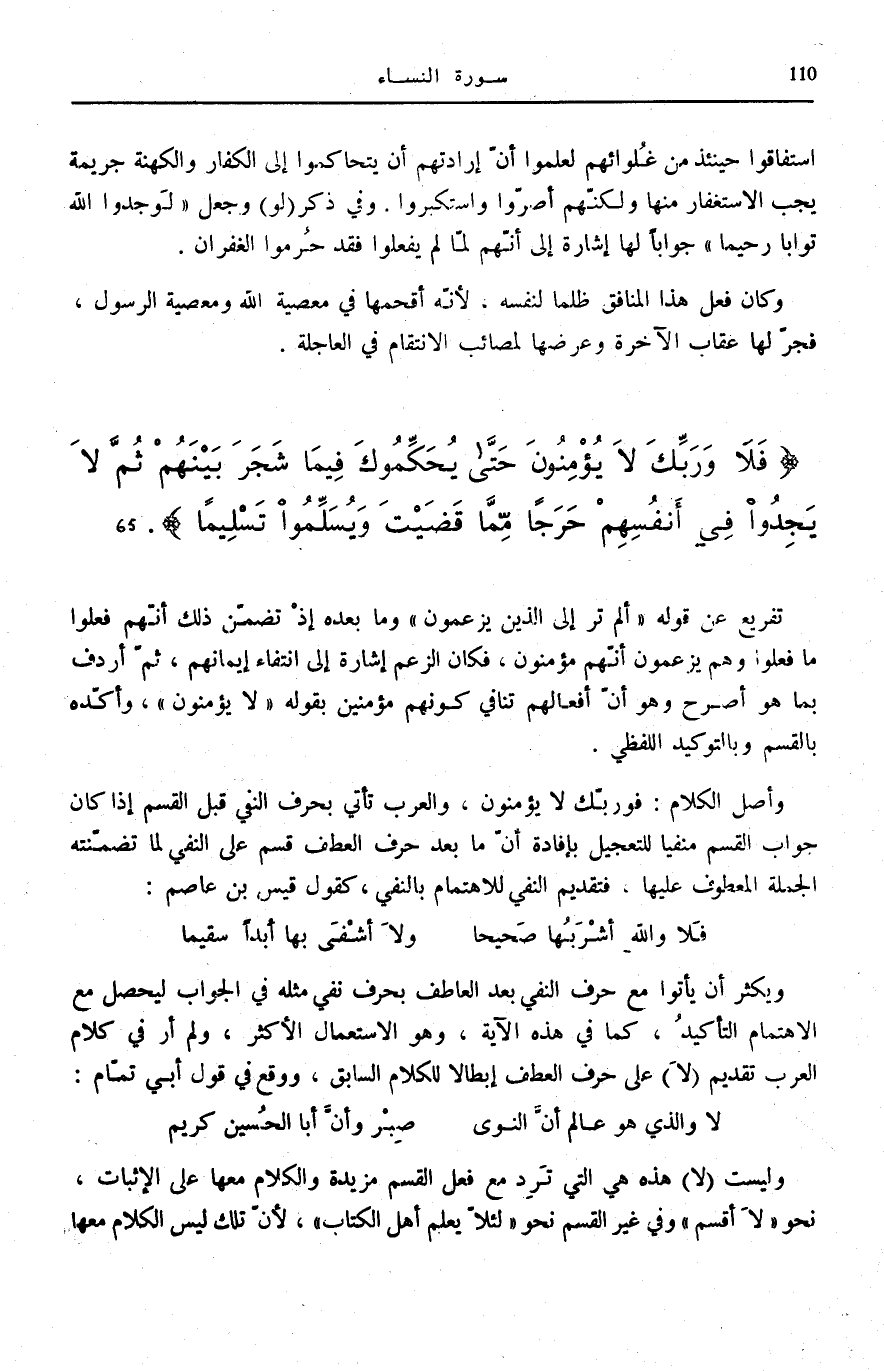 وأصل الْكَلَام: فو ربّك لَا يُؤْمِنُونَ، وَالْعَرَبُ تَأْتِي بِحَرْفِ النَّفْيِ قَبْلَ الْقَسَمِ إِذَا كَانَ جَوَابُ الْقَسَمِ مَنْفِيًّا لِلتَّعْجِيلِ بِإِفَادَةِ أَنَّ مَا بَعْدَ حَرْفِ الْعَطْفِ قَسَمٌ عَلَى النَّفْيِ لِمَا تَضَمَّنَتْهُ الْجُمْلَةُ الْمَعْطُوفُ عَلَيْهَا، فَتَقْدِيمُ النَّفْيِ لِلِاهْتِمَامِ بِالنَّفْيِ، كَقَوْلِ قَيْسِ بْنِ عَاصِمٍ:
