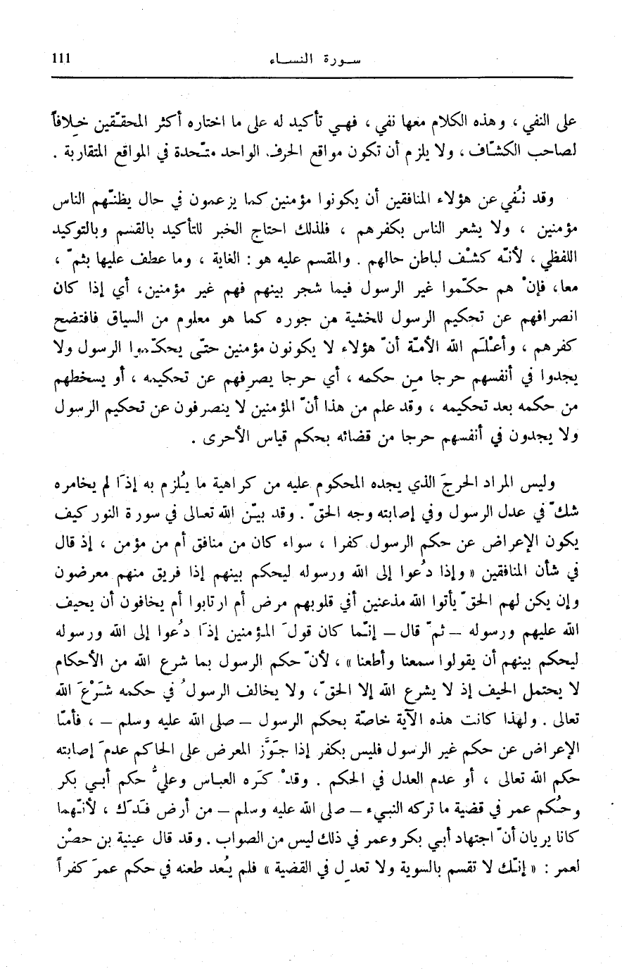 وَلَيْسَ الْمُرَادُ الْحَرَجَ الَّذِي يَجِدُهُ الْمَحْكُومُ عَلَيْهِ مِنْ كَرَاهِيَةِ مَا يُلْزَمُ بِهِ إِذَا لَمْ يُخَامِرْهُ شَكٌّ فِي عَدْلِ الرَّسُولِ وَفِي إِصَابَتِهِ وَجْهَ الْحَقِّ. وَقَدْ بَيَّنَ اللَّهُ تَعَالَى فِي سُورَةِ النُّورِ كَيْفَ يَكُونُ الْإِعْرَاضُ عَنْ حُكْمِ الرَّسُولِ كُفْرًا، سَوَاءً كَانَ مِنْ مُنَافِقٍ أَمْ مِنْ مُؤْمِنٍ، إِذْ قَالَ فِي شَأْنِ الْمُنَافِقِينَ «وَإِذَا دُعُوا إِلَى اللَّهِ وَرَسُولِهِ لِيَحْكُمَ بَيْنَهُمْ إِذَا فَرِيقٌ مِنْهُمْ مُعْرِضُونَ وَإِنْ يَكُنْ لَهُمُ الْحَقُّ يَأْتُوا الله مُذْعِنِينَ أَفِي قُلُوبِهِمْ مَرَضٌ أَمِ ارْتَابُوا أَمْ يَخَافُونَ أَنْ يَحِيفَ اللَّهُ عَلَيْهِمْ وَرَسُولُهُ- ثُمَّ قَالَ- إِنَّمَا كَانَ قَوْلَ الْمُؤْمِنِينَ إِذَا دُعُوا إِلَى اللَّهِ وَرَسُولِهِ لِيَحْكُمَ بَيْنَهُمْ أَنْ يَقُولُوا سَمِعْنَا وَأَطَعْنَا» ، لِأَنَّ حُكْمَ الرَّسُولِ بِمَا شَرَعَ اللَّهُ مِنَ الْأَحْكَامِ لَا يَحْتَمِلُ الْحَيْفَ إِذْ لَا يُشَرِّعُ اللَّهُ إِلَّا الْحَقَّ، وَلَا يُخَالِفُ الرَّسُولُ فِي حُكْمِهِ شَرْعَ اللَّهِ تَعَالَى. وَلِهَذَا كَانَتْ هَذِهِ الْآيَةُ خَاصَّةً بِحُكْمِ الرَّسُولِ صَلَّى اللهُ عَلَيْهِ وَسَلَّمَ، فَأَمَّا الْإِعْرَاضُ عَنْ حُكْمِ غَيْرِ الرَّسُولِ فَلَيْسَ بِكُفْرٍ إِذَا جَوَّزَ