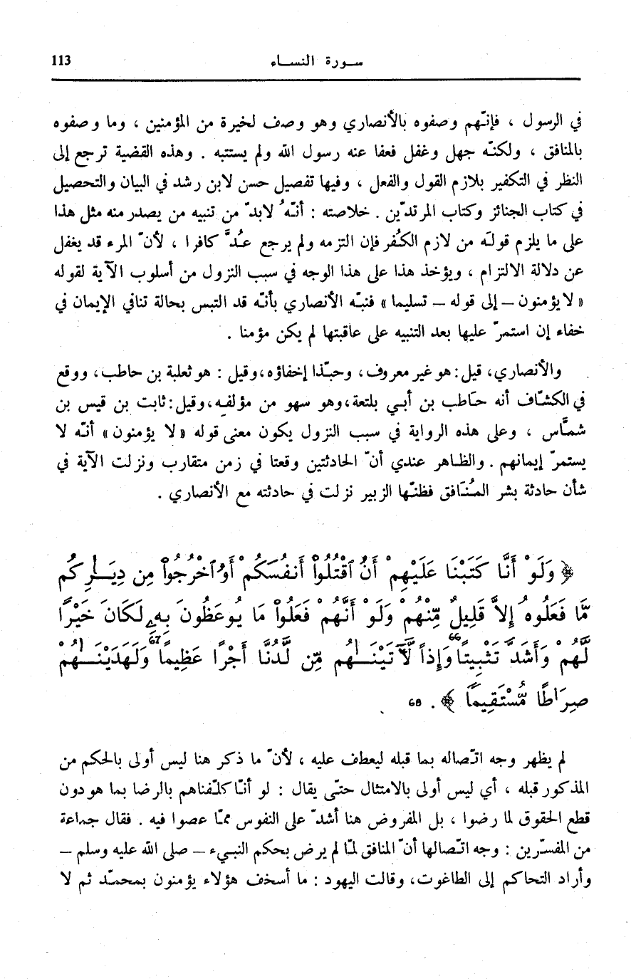 وَهَذِهِ الْقَضِيَّةُ تَرْجِعُ إِلَى النَّظَرِ فِي التَّكْفِيرِ بِلَازِمِ الْقَوْلِ وَالْفِعْلِ، وَفِيهَا تَفْصِيلٌ حَسَنٌ لِابْنِ رُشْدٍ فِي الْبَيَانِ وَالتَّحْصِيلِ فِي كِتَابِ «الْجَنَائِزِ» وَكِتَابِ «الْمُرْتَدِّينَ» . خُلَاصَتُهُ: أَنَّهُ لَا بُدَّ مِنْ تَنْبِيهِ مَنْ يَصْدُرُ مِنْهُ مِثْلُ هَذَا عَلَى مَا يَلْزَمُ قَوْلَهُ مِنْ لَازِمِ الْكُفْرِ فَإِنِ الْتَزَمَهُ وَلَمْ يَرْجِعْ عُدَّ كَافِرًا، لِأَنَّ الْمَرْءَ قَدْ يَغْفُلُ عَنْ دَلَالَةِ الِالْتِزَامِ، وَيُؤْخَذُ هَذَا عَلَى هَذَا الْوَجْهِ فِي سَبَبِ النُّزُولِ مِنْ أُسْلُوبِ الْآيَةِ لِقَوْلِهِ: لَا يُؤْمِنُونَ- إِلَى قَوْلِهِ- تَسْلِيماً فَنَبَّهَ الْأَنْصَارِيُّ بِأَنَّهُ قَدِ الْتَبَسَ بِحَالَةٍ تُنَافِي الْإِيمَانَ فِي خَفَاءٍ إِنِ اسْتَمَرَّ عَلَيْهَا بَعْدَ التَّنْبِيهِ عَلَى عَاقِبَتِهَا لَمْ يَكُنْ مُؤْمِنًا.