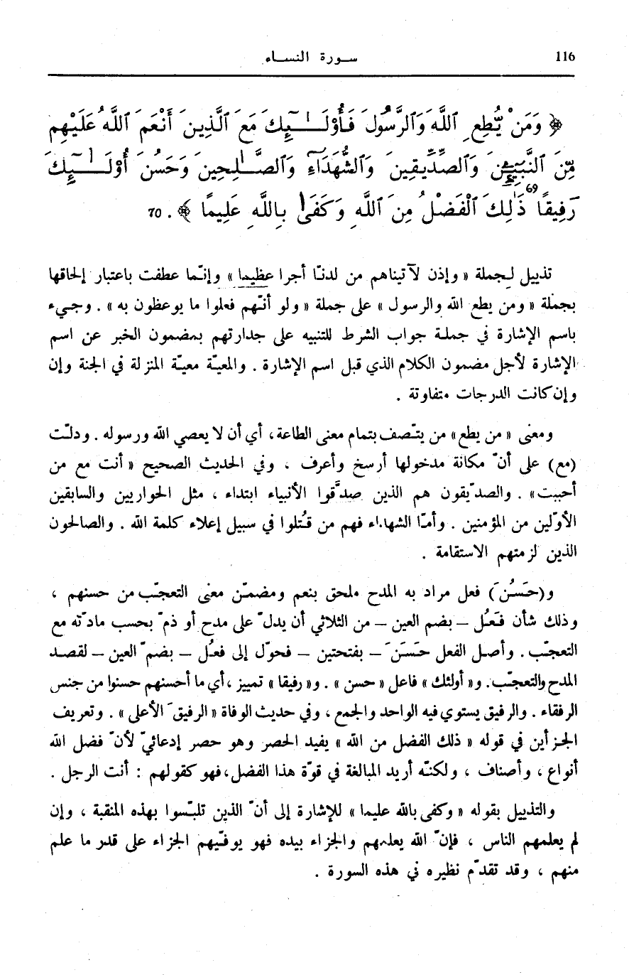 وَمَنْ يُطِعِ اللَّهَ وَالرَّسُولَ فَأُولئِكَ مَعَ الَّذِينَ أَنْعَمَ اللَّهُ عَلَيْهِمْ مِنَ النَّبِيِّينَ وَالصِّدِّيقِينَ وَالشُّهَداءِ وَالصَّالِحِينَ وَحَسُنَ أُولئِكَ رَفِيقاً (69) ذلِكَ الْفَضْلُ مِنَ اللَّهِ وَكَفى بِاللَّهِ عَلِيماً (70)
