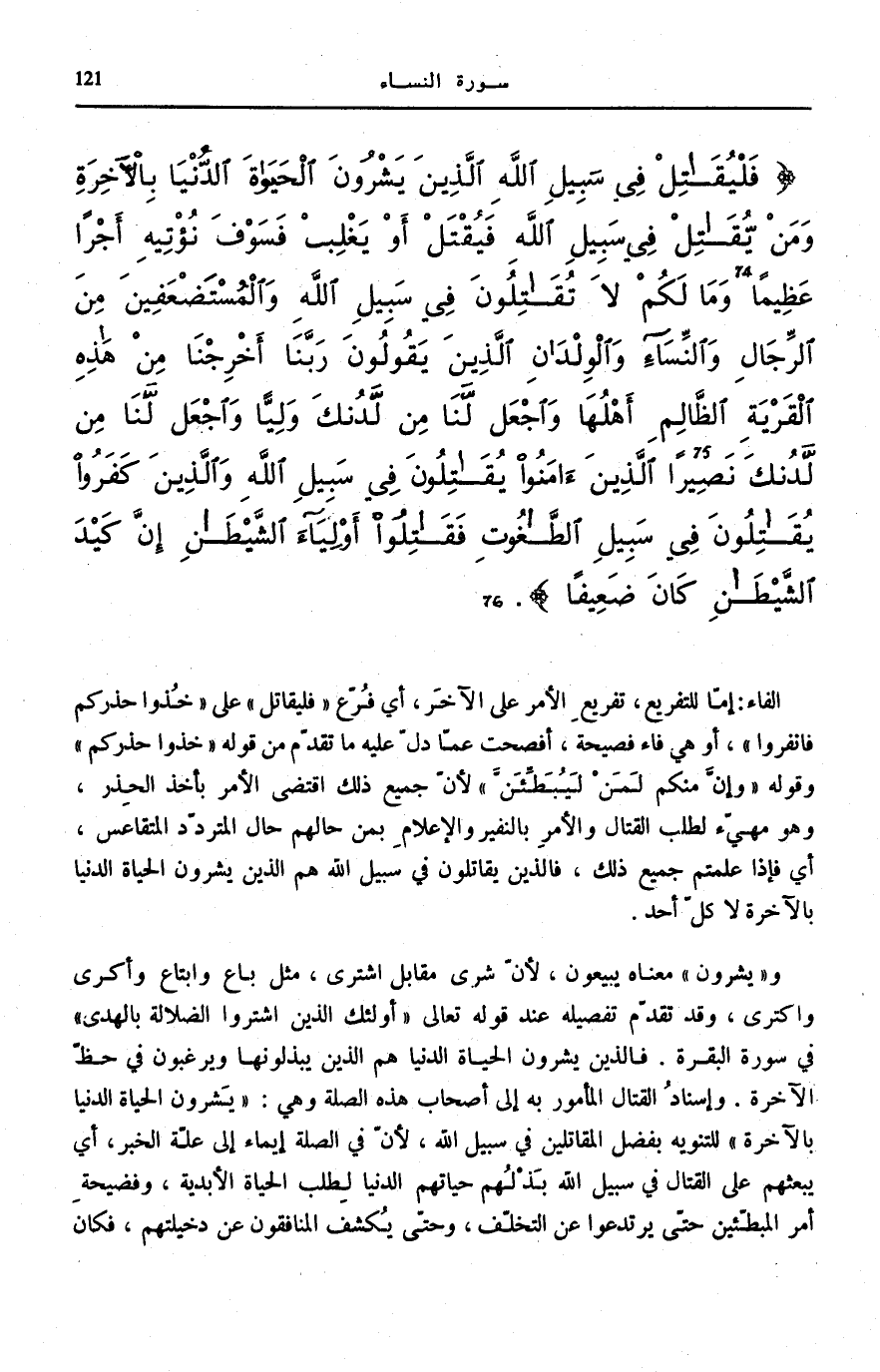 فَلْيُقاتِلْ فِي سَبِيلِ اللَّهِ الَّذِينَ يَشْرُونَ الْحَياةَ الدُّنْيا بِالْآخِرَةِ وَمَنْ يُقاتِلْ فِي سَبِيلِ اللَّهِ فَيُقْتَلْ أَوْ يَغْلِبْ فَسَوْفَ نُؤْتِيهِ أَجْراً عَظِيماً (74) وَما لَكُمْ لَا تُقاتِلُونَ فِي سَبِيلِ اللَّهِ وَالْمُسْتَضْعَفِينَ مِنَ الرِّجالِ وَالنِّساءِ وَالْوِلْدانِ الَّذِينَ يَقُولُونَ رَبَّنا أَخْرِجْنا مِنْ هذِهِ الْقَرْيَةِ الظَّالِمِ أَهْلُها وَاجْعَلْ لَنا مِنْ لَدُنْكَ وَلِيًّا وَاجْعَلْ لَنا مِنْ لَدُنْكَ نَصِيراً (75) الَّذِينَ آمَنُوا يُقاتِلُونَ فِي سَبِيلِ اللَّهِ وَالَّذِينَ كَفَرُوا يُقاتِلُونَ فِي سَبِيلِ الطَّاغُوتِ فَقاتِلُوا أَوْلِياءَ الشَّيْطانِ إِنَّ كَيْدَ الشَّيْطانِ كانَ ضَعِيفاً (76)
