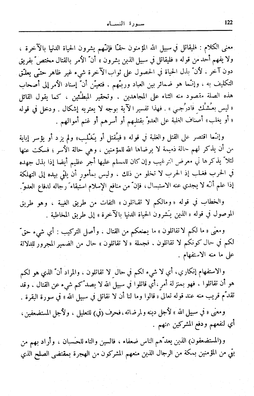 مَعْنَى الْكَلَامِ: فَلْيُقَاتِلْ فِي سَبِيلِ اللَّهِ الْمُؤْمِنُونَ حَقًّا فَإِنَّهُمْ يَشْرُونَ الْحَيَاةَ الدُّنْيَا بِالْآخِرَةِ، وَلَا يَفْهَمُ أَحَدٌ مِنْ قَوْلِهِ: فَلْيُقاتِلْ فِي سَبِيلِ اللَّهِ الَّذِينَ يَشْرُونَ أَنَّ الْأَمْرَ بِالْقِتَالِ مُخْتَصٌّ بِفَرِيقٍ دُونَ آخَرَ، لِأَنَّ بَذْلَ الْحَيَاةِ فِي الْحُصُولِ عَلَى ثَوَابِ الْآخِرَةِ شَيْءٌ غَيْرُ ظَاهِرٍ حَتَّى يُعَلَّقَ التَّكْلِيفُ بِهِ، وَإِنَّمَا هُوَ ضَمَائِرُ بَيْنَ الْعِبَادِ وَرَبِّهِمْ، فَتَعَيَّنَ أَنَّ إِسْنَادَ الْأَمْرِ إِلَى أَصْحَابِ هَذِهِ الصِّلَةِ مَقْصُودٌ مِنْهُ الثَّنَاءُ عَلَى الْمُجَاهِدِينَ، وَتَحْقِيرُ الْمُبَطِّئِينَ، كَمَا يَقُولُ الْقَائِلُ «لَيْسَ بِعُشِّكِ فَادْرُجِي» . فَهَذَا تَفْسِيرُ الْآيَةِ بِوَجْهٍ لَا يَعْتَرِيهِ إِشْكَالٌ. وَدَخَلَ فِي قَوْلِهِ: أَوْ يَغْلِبْ أَصْنَافُ الْغَلَبَةِ عَلَى الْعَدُوِّ بِقَتْلِهِمْ أَوْ أَسْرِهِمْ أَوْ غُنْمِ أَمْوَالِهِمْ.