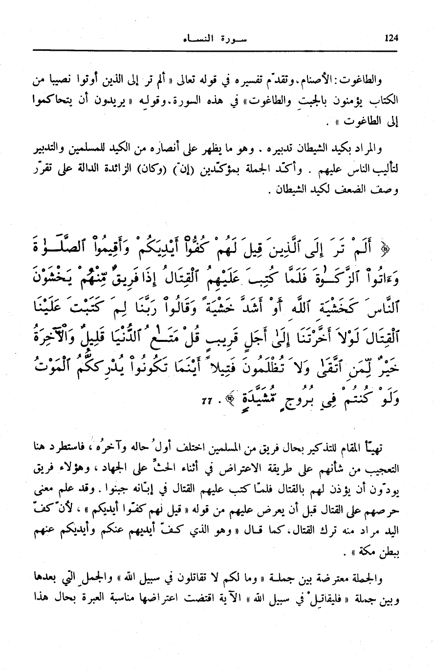 أَلَمْ تَرَ إِلَى الَّذِينَ قِيلَ لَهُمْ كُفُّوا أَيْدِيَكُمْ وَأَقِيمُوا الصَّلاةَ وَآتُوا الزَّكاةَ فَلَمَّا كُتِبَ عَلَيْهِمُ الْقِتالُ إِذا فَرِيقٌ مِنْهُمْ يَخْشَوْنَ النَّاسَ كَخَشْيَةِ اللَّهِ أَوْ أَشَدَّ خَشْيَةً وَقالُوا رَبَّنا لِمَ كَتَبْتَ عَلَيْنَا الْقِتالَ لَوْلا أَخَّرْتَنا إِلى أَجَلٍ قَرِيبٍ قُلْ مَتاعُ الدُّنْيا قَلِيلٌ وَالْآخِرَةُ خَيْرٌ لِمَنِ اتَّقى وَلا تُظْلَمُونَ فَتِيلًا (77) أَيْنَما تَكُونُوا يُدْرِكْكُمُ الْمَوْتُ وَلَوْ كُنْتُمْ فِي بُرُوجٍ مُشَيَّدَةٍ تَهَيَّأَ الْمَقَامُ لِلتَّذْكِيرِ بِحَالِ فَرِيقٍ مِنَ الْمُسْلِمِينَ اخْتَلَفَ أَوَّلُ حَالِهِ وَآخِرُهُ، فَاسْتَطْرَدَ هُنَا