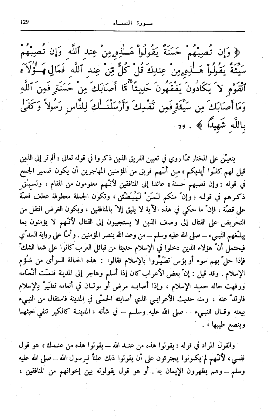 يَتَعَيَّنُ عَلَى الْمُخْتَارِ مِمَّا رُوِيَ فِي تَعْيِينِ الْفَرِيقِ الَّذِينَ ذُكِرُوا فِي قَوْلِهِ تَعَالَى: أَلَمْ تَرَ إِلَى الَّذِينَ قِيلَ لَهُمْ كُفُّوا أَيْدِيَكُمْ مِنْ أَنَّهُمْ فَرِيقٌ مِنَ الْمُؤْمِنِينَ الْمُهَاجِرِينَ أَنْ يَكُونَ ضَمِيرُ الْجَمْعِ فِي قَوْلِهِ: وَإِنْ تُصِبْهُمْ حَسَنَةٌ عَائِدًا إِلَى الْمُنَافِقِينَ لِأَنَّهُمْ مَعْلُومُونَ مِنَ الْمَقَامِ، وَلِسَبْقِ ذِكْرِهِمْ فِي قَوْلِهِ: وَإِنَّ مِنْكُمْ لَمَنْ لَيُبَطِّئَنَّ [النِّسَاء: 72] وَتَكُونُ الْجُمْلَةُ مَعْطُوفَةً عَطْفَ