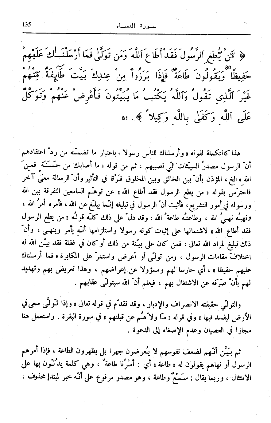 مَنْ يُطِعِ الرَّسُولَ فَقَدْ أَطاعَ اللَّهَ وَمَنْ تَوَلَّى فَما أَرْسَلْناكَ عَلَيْهِمْ حَفِيظاً (80) وَيَقُولُونَ طاعَةٌ فَإِذا بَرَزُوا مِنْ عِنْدِكَ بَيَّتَ طائِفَةٌ مِنْهُمْ غَيْرَ الَّذِي تَقُولُ وَاللَّهُ يَكْتُبُ مَا يُبَيِّتُونَ فَأَعْرِضْ عَنْهُمْ وَتَوَكَّلْ عَلَى اللَّهِ وَكَفى بِاللَّهِ وَكِيلاً (81)