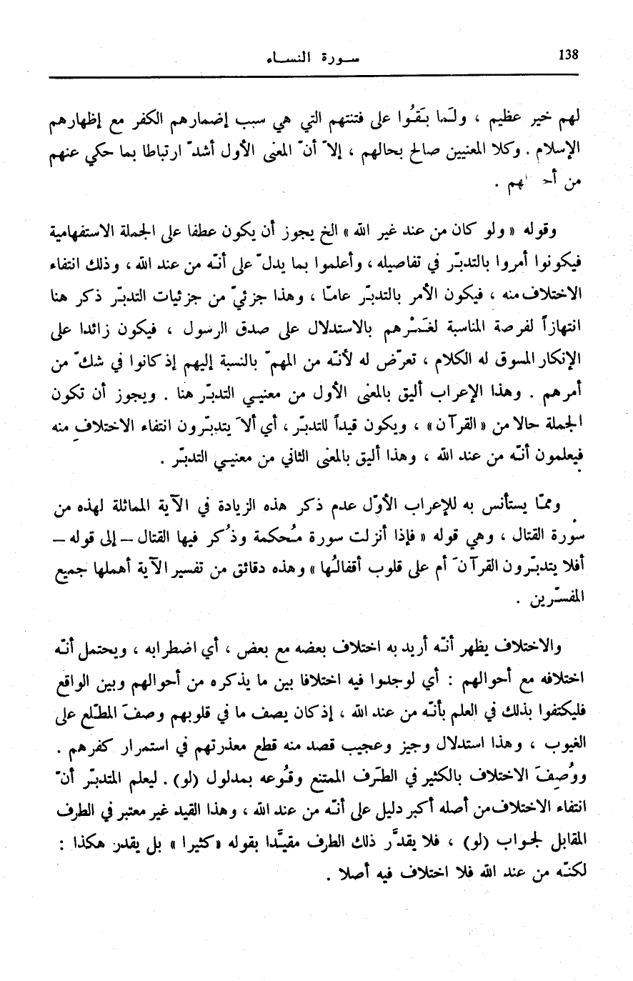 وَقَوْلُهُ: وَلَوْ كانَ مِنْ عِنْدِ غَيْرِ اللَّهِ إِلَخْ يَجُوزُ أَنْ يَكُونَ عَطْفًا عَلَى الْجُمْلَةِ الِاسْتِفْهَامِيَّةِ فَيَكُونُوا أُمِرُوا بِالتَّدَبُّرِ فِي تَفَاصِيلِهِ، وَأُعْلِمُوا بِمَا يَدُلُّ عَلَى أَنَّهُ مِنْ عِنْدِ اللَّهِ، وَذَلِكَ انْتِفَاءُ الِاخْتِلَافِ مِنْهُ، فَيَكُونُ الْأَمْرُ بِالتَّدَبُّرِ عَامًّا، وَهَذَا جُزْئِيٌّ مِنْ جُزْئِيَّاتِ التَّدَبُّرِ ذُكِرَ هُنَا انْتِهَازًا لِفُرْصَةِ الْمُنَاسَبَةِ لَغَمْرِهِمْ بِالِاسْتِدْلَالِ عَلَى صِدْقِ الرَّسُولِ، فَيَكُونُ زَائِدًا عَلَى الْإِنْكَارِ الْمَسُوقِ لَهُ الْكَلَامُ، تَعَرَّضَ لَهُ لِأَنَّهُ مِنَ الْمُهِمِّ بِالنِّسْبَةِ إِلَيْهِمْ إِذْ كَانُوا فِي شَكٍّ مِنْ أَمْرِهِمْ. وَهَذَا الْإِعْرَابُ أَلْيَقُ بِالْمَعْنَى الْأَوَّلِ مِنْ مَعْنَيَيِ التَّدَبُّرِ هُنَا. وَيَجُوزُ أَنْ تَكُونَ الْجُمْلَةُ حَالًا مِنَ «الْقُرْآنِ» ، وَيَكُونُ قَيْدًا لِلتَّدَبُّرِ، أَيْ أَلَا يَتَدَبَّرُونَ انْتِفَاءَ الِاخْتِلَافِ مِنْهُ فَيَعْلَمُونَ أَنَّهُ مِنْ عِنْدِ اللَّهِ، وَهَذَا أَلْيَقُ بِالْمَعْنَى الثَّانِي مِنْ مَعْنَيَيِ التَّدَبُّرِ.