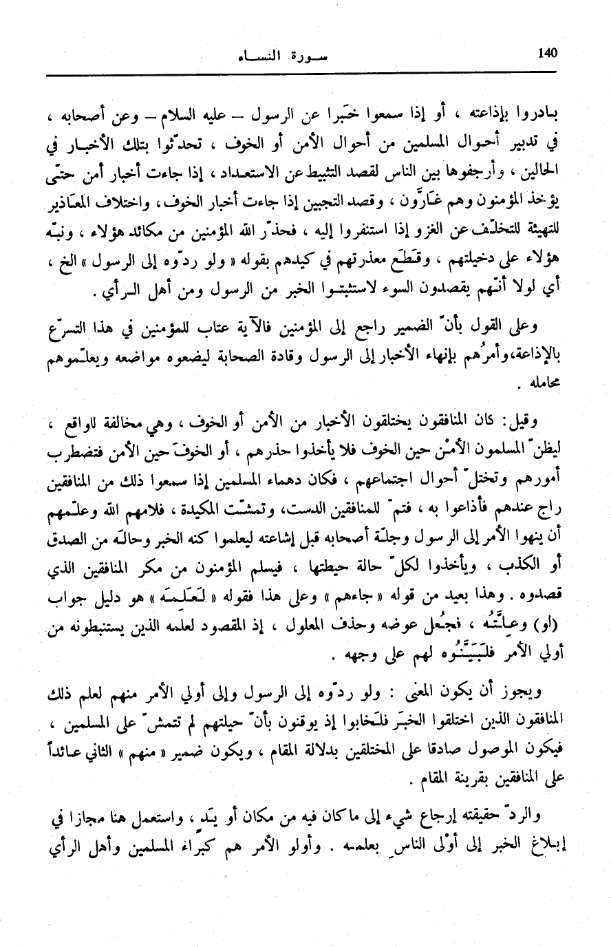 وَعَلَى الْقَوْلِ بِأَنَّ الضَّمِيرَ رَاجِعٌ إِلَى الْمُؤْمِنِينَ فَالْآيَةُ عِتَابٌ لِلْمُؤْمِنِينَ فِي هَذَا التَّسَرُّعِ بِالْإِذَاعَةِ، وَأَمْرُهُمْ بِإِنْهَاءِ الْأَخْبَارِ إِلَى الرَّسُولِ وَقَادَةِ الصَّحَابَةِ لِيَضَعُوهُ مَوَاضِعَهُ وَيُعَلِّمُوهُمْ مَحَامِلَهُ.
