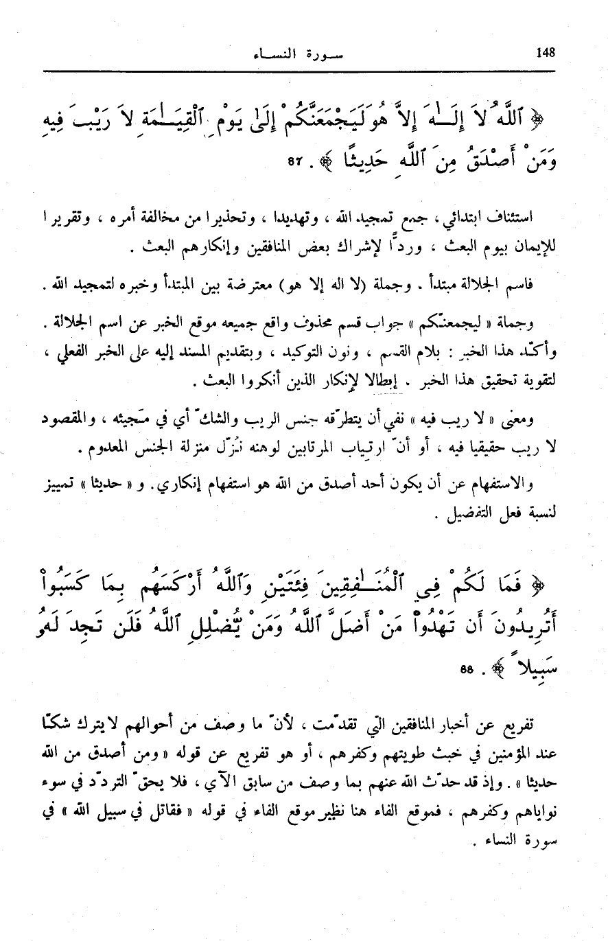 اللَّهُ لَا إِلهَ إِلاَّ هُوَ لَيَجْمَعَنَّكُمْ إِلى يَوْمِ الْقِيامَةِ لَا رَيْبَ فِيهِ وَمَنْ أَصْدَقُ مِنَ اللَّهِ حَدِيثاً (87)