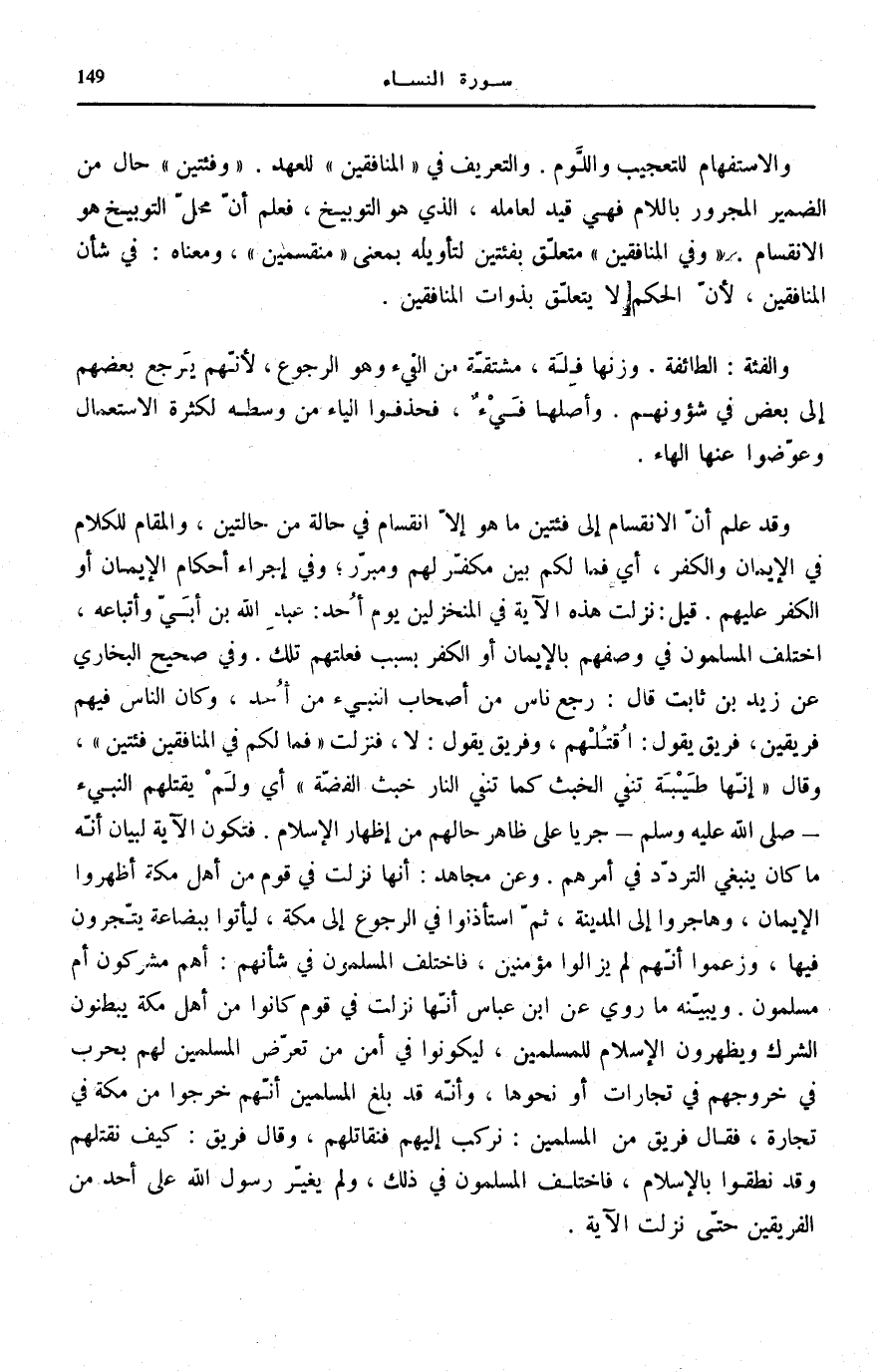 وَقَدْ عُلِمَ أَنَّ الِانْقِسَامَ إِلَى فِئَتَيْنِ مَا هُوَ إِلَّا انْقِسَامٌ فِي حَالَةٍ مِنْ حَالَتَيْنِ، وَالْمَقَامُ لِلْكَلَامِ فِي الْإِيمَانِ وَالْكُفْرِ، أَيْ فَمَا لَكُمْ بَيْنَ مُكَفِّرٍ لَهُمْ وَمُبَرِّرٍ، وَفِي إِجْرَاءِ أَحْكَامِ الْإِيمَانِ أَوِ الْكُفْرِ عَلَيْهِمْ. قِيلَ: نَزَلَتْ هَذِهِ الْآيَة فِي المنخزلين يَوْمَ أُحُدٍ: عَبْدِ اللَّهِ بْنِ أُبَيٍّ وَأَتْبَاعِهِ، اخْتَلَفَ الْمُسْلِمُونَ فِي وَصْفِهِمْ بِالْإِيمَانِ أَوِ الْكُفْرِ بِسَبَبِ فِعْلَتِهِمْ تِلْكَ. وَفِي «صَحِيحِ الْبُخَارِيِّ» عَنْ زَيْدِ بْنِ ثَابِتٍ قَالَ: رَجَعَ نَاسٌ من أَصْحَاب النَّبِي مِنْ أُحُدٍ، وَكَانَ النَّاسُ فِيهِمْ فَرِيقَيْنِ، فَرِيقٌ يَقُولُ: اقْتُلْهُمْ، وَفَرِيقٌ يَقُولُ: لَا، فَنَزَلَتْ «فَمَا لَكُمْ فِي الْمُنَافِقِينَ فِئَتَيْنِ» ، وَقَالَ: «إِنَّهَا طَيْبَةُ تَنْفِي الْخَبَثَ كَمَا تَنْفِي النَّارُ خَبَثَ الْفِضَّةِ» أَيْ وَلَمْ يَقْتُلْهُمُ النَّبِيءُ صَلَّى اللهُ عَلَيْهِ وَسَلَّمَ جَرْيًا عَلَى ظَاهِرِ حَالِهِمْ مِنْ إِظْهَارِ الْإِسْلَامِ. فَتَكُونُ الْآيَةُ لِبَيَانِ أَنَّهُ مَا كَانَ يَنْبَغِي التَّرَدُّدُ فِي أَمْرِهِمْ. وَعَنْ مُجَاهِدٍ: أَنَّهَا نَزَلَتْ فِي قَوْمٍ مِنْ أَهْلِ مَكَّةَ أَظْهَرُوا الْإِيمَانَ، وَهَاجَرُوا إِلَى الْمَدِينَةِ، ثُمَّ اسْتَأْذَنُوا فِي الرُّجُوعِ إِلَى مَكَّةَ، لِيَأْتُوا بِبِضَاعَةٍ يَتَّجِرُونَ فِيهَا، وَزَعَمُوا أَنَّهُمْ لَمْ يَزَالُوا مُؤْمِنِينَ، فَاخْتَلَفَ الْمُسْلِمُونَ فِي شَأْنِهِمْ: أَهُمْ مُشْرِكُونَ أَمْ مُسْلِمُونَ. وَيُبَيِّنُهُ مَا رُوِيَ عَنِ ابْنِ عَبَّاسٍ أَنَّهَا نَزَلَتْ فِي قَوْمٍ كَانُوا مِنْ أَهْلِ مَكَّةَ يُبْطِنُونَ الشِّرْكَ وَيُظْهِرُونَ الْإِسْلَامَ لِلْمُسْلِمِينَ، لِيَكُونُوا فِي أَمْنٍ مِنْ تَعَرُّضِ الْمُسْلِمِينَ لَهُمْ بِحَرْبٍ فِي خُرُوجِهِمْ فِي تِجَارَاتٍ أَوْ نَحْوِهَا، وَأَنَّهُ قَدْ بَلَغَ الْمُسْلِمِينَ أَنَّهُمْ خَرَجُوا مِنْ مَكَّةَ فِي تِجَارَةٍ، فَقَالَ فَرِيقٌ مِنَ الْمُسْلِمِينَ: