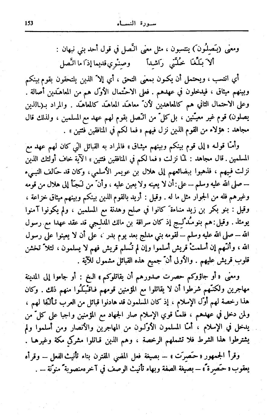 وَمعنى أَوْ جاؤُكُمْ حَصِرَتْ صُدُورُهُمْ أَنْ يُقاتِلُوكُمْ إِلَخْ: أَوْ جَاءُوا إِلَى الْمَدِينَةِ مُهَاجِرِينَ وَلَكِنَّهُمْ شَرَطُوا أَنْ لَا يُقَاتِلُوا مَعَ الْمُؤْمِنِينَ قَوْمَهُمْ فَاقْبَلُوا مِنْهُمْ ذَلِكَ. وَكَانَ هَذَا رُخْصَةً لَهُمْ أَوَّلَ الْإِسْلَامِ، إِذْ كَانَ الْمُسْلِمُونَ قَدْ هَادَنُوا قَبَائِلَ مِنَ الْعَرَبِ تَأَلُّفًا لَهُمْ، وَلِمَنْ دَخَلَ فِي عَهْدِهِمْ، فَلَمَّا قَوِيَ الْإِسْلَامُ صَارَ الْجِهَادُ مَعَ الْمُؤْمِنِينَ وَاجِبًا عَلَى كُلِّ مَنْ يَدْخُلُ فِي الْإِسْلَامِ، أَمَّا الْمُسْلِمُونَ الْأَوَّلُونَ مِنَ الْمُهَاجِرِينَ وَالْأَنْصَارِ وَمَنْ أَسْلَمُوا وَلَمْ يَشْتَرِطُوا هَذَا الشَّرْطَ فَلَا تَشْمَلُهُمُ الرُّخْصَةُ، وَهُمُ الَّذِينَ قَاتَلُوا مُشْرِكِي مَكَّةَ وَغَيْرِهَا.