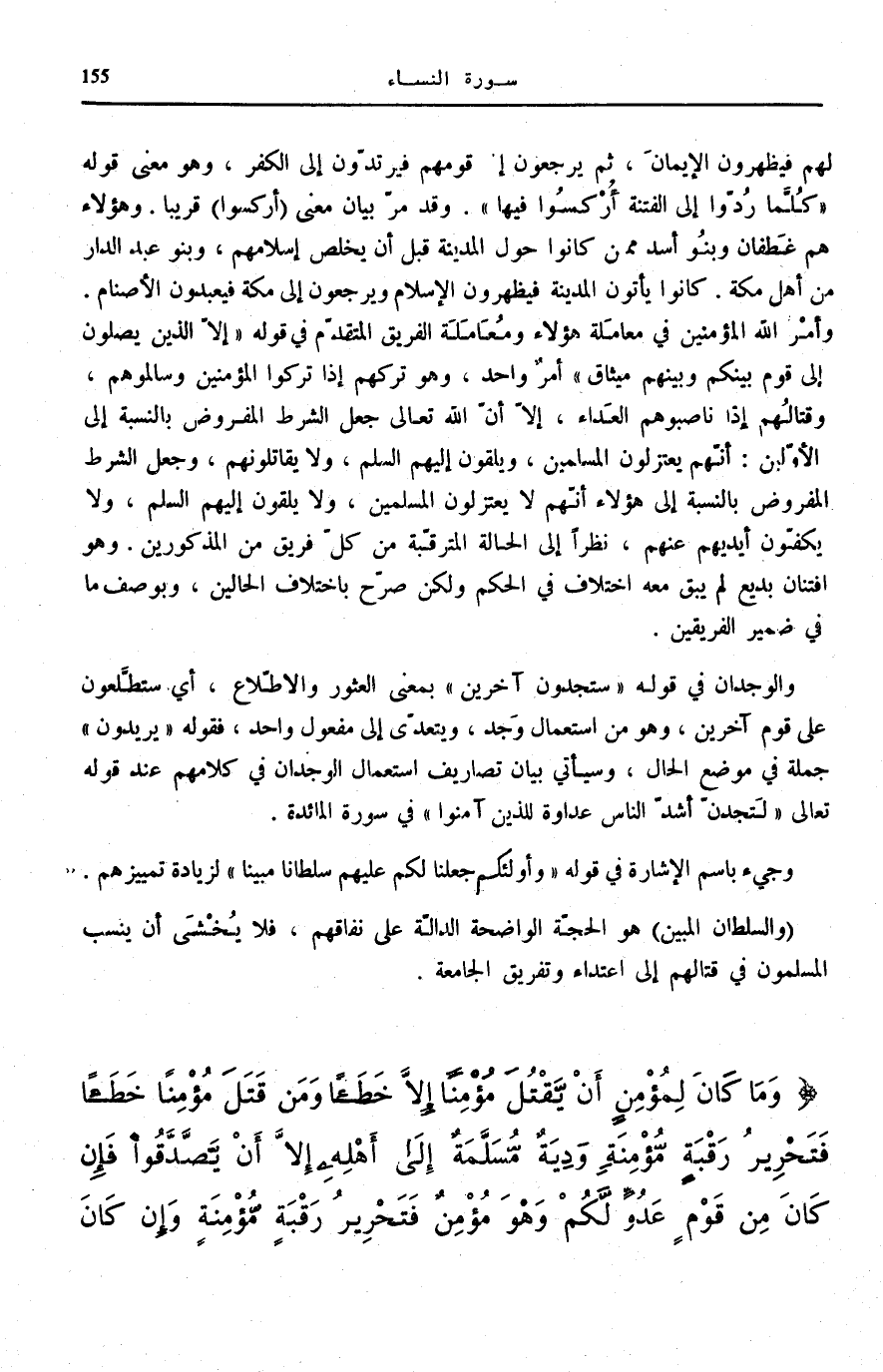 مُعَامَلَةِ هَؤُلَاءِ وَمُعَامَلَةِ الْفَرِيقِ الْمُتَقَدِّمِ فِي قَوْلِهِ: إِلَّا الَّذِينَ يَصِلُونَ إِلى قَوْمٍ بَيْنَكُمْ وَبَيْنَهُمْ مِيثاقٌ [النِّسَاء: 90] أَمْرٌ وَاحِدٌ، وَهُوَ تَرْكُهُمْ إِذَا تَرَكُوا الْمُؤْمِنِينَ وَسَالَمُوهُمْ، وَقِتَالُهُمْ إِذَا نَاصَبُوهُمُ الْعَدَاءَ، إِلَّا أَنَّ اللَّهَ تَعَالَى جَعَلَ الشَّرْطَ الْمَفْرُوضَ بِالنِّسْبَةِ إِلَى الْأَوَّلِينَ: أَنَّهُمْ يَعْتَزِلُونَ الْمُسْلِمِينَ، وَيُلْقُونَ إِلَيْهِمُ السَّلَمَ، وَلَا يُقَاتِلُونَهُمْ، وَجَعَلَ الشَّرْطَ الْمَفْرُوضَ بِالنِّسْبَةِ إِلَى هَؤُلَاءِ أَنَّهُمْ لَا يَعْتَزِلُونَ الْمُسْلِمِينَ، وَلَا يُلْقُونَ إِلَيْهِمُ السَّلَمَ، وَلَا يَكُفُّونَ أَيْدِيَهُمْ عَنْهُمْ، نَظَرًا إِلَى الْحَالَةِ الْمُتَرَقَّبَةِ مِنْ كُلِّ فَرِيقٍ مِنَ الْمَذْكُورِينَ. وَهُوَ افْتِنَانٌ بَدِيعٌ لَمْ يَبْقَ مَعَهُ اخْتِلَافٌ فِي الْحُكْمِ وَلَكِنْ صَرَّحَ بِاخْتِلَافِ الْحَالَيْنِ، وَبِوَصْفِ مَا فِي ضَمِيرِ الْفَرِيقَيْنِ.