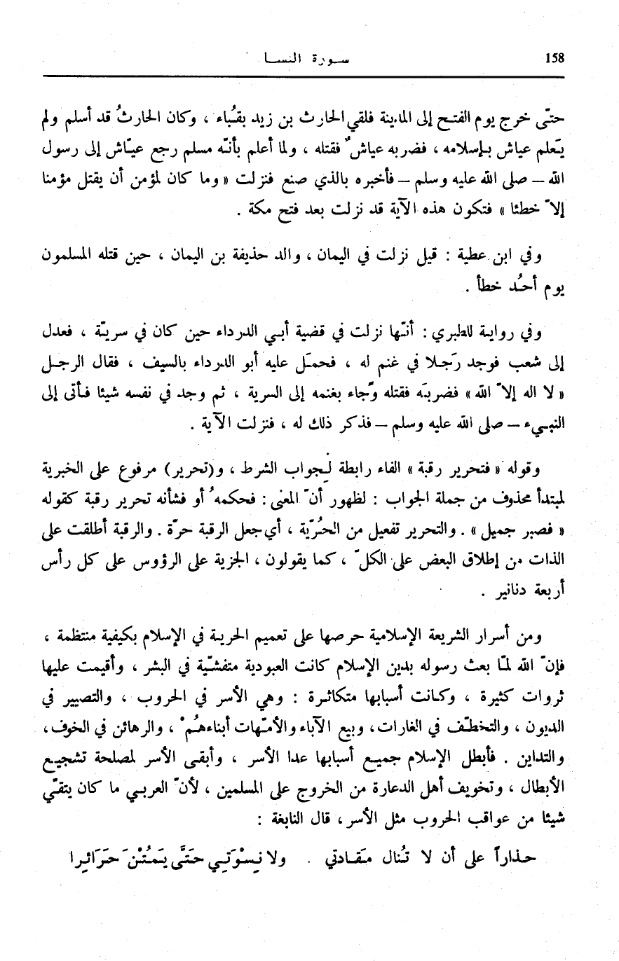 حَتَّى خَرَجَ يَوْمَ الْفَتْحِ إِلَى الْمَدِينَةِ فَلَقِيَ الْحَارِثَ بْنَ زَيْدٍ بِقُبَاءٍ، وَكَانَ الْحَارِثُ قَدْ أَسْلَمَ وَلَمْ يَعْلَمْ عَيَّاشٌ بِإِسْلَامِهِ، فَضَرَبَهُ عَيَّاشٌ فَقَتَلَهُ، وَلَمَّا أُعْلِمَ بِأَنَّهُ مُسْلِمٌ رَجَعَ عَيَّاشٌ إِلَى رَسُولِ اللَّهِ صَلَّى اللهُ عَلَيْهِ وَسَلَّمَ فَأَخْبَرَهُ بِالَّذِي صَنَعَ فَنَزَلَتْ: وَما كانَ لِمُؤْمِنٍ أَنْ يَقْتُلَ مُؤْمِناً إِلَّا خَطَأً فَتَكُونُ هَذِهِ الْآيَةُ قَدْ نَزَلَتْ بَعْدَ فَتْحِ مَكَّةَ.