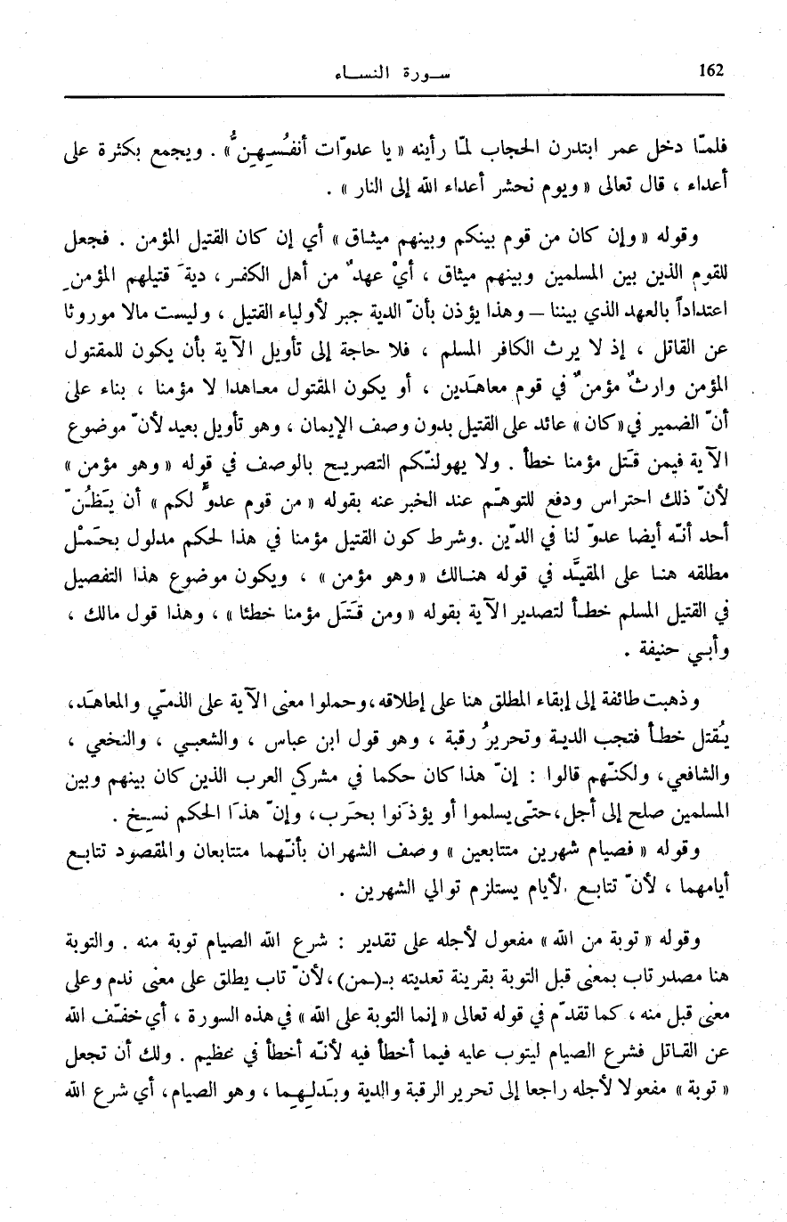 وَقَوْلُهُ: وَإِنْ كانَ مِنْ قَوْمٍ بَيْنَكُمْ وَبَيْنَهُمْ مِيثاقٌ أَيْ إِنْ كَانَ الْقَتِيلُ الْمُؤْمِنَ. فَجَعَلَ لِلْقَوْمِ الَّذِينَ بَيْنَ الْمُسْلِمِينَ وَبَيْنَهُمْ مِيثَاقٌ، أَيْ عَهْدٌ مِنْ أَهْلِ الْكُفْرِ، دِيَةَ قَتِيلِهِمُ الْمُؤْمِنِ اعْتِدَادًا بِالْعَهْدِ الَّذِي بَيْنَنَا- وَهَذَا يُؤْذِنُ بِأَنَّ الدِّيَةَ جَبْرٌ لِأَوْلِيَاءِ الْقَتِيلِ، وَلَيْسَتْ مَالًا مَوْرُوثًا عَنِ الْقَاتِلِ، إِذْ لَا يَرْثُ الْكَافِرُ الْمُسْلِمَ، فَلَا حَاجَةَ إِلَى تَأْوِيلِ الْآيَةِ بِأَنْ يَكُونَ لِلْمَقْتُولِ الْمُؤْمِنِ وَارِثٌ مُؤْمِنٌ فِي قَوْمٍ مُعَاهَدِينَ، أَوْ يَكُونَ الْمَقْتُولُ مُعَاهَدًا لَا مُؤْمِنًا، بِنَاءً عَلَى أَنَّ الضَّمِيرَ فِي «كَانَ» عَائِدٌ عَلَى الْقَتِيلِ بِدُونِ وَصْفِ الْإِيمَانِ، وَهُوَ تَأْوِيلٌ بَعِيدٌ لِأَنَّ مَوْضُوعَ الْآيَةِ فِيمَنْ قَتَلَ مُؤْمِنًا خَطَأً. وَلَا يَهُولَنَّكُمُ التَّصْرِيحُ بِالْوَصْفِ فِي قَوْلِهِ: وَهُوَ مُؤْمِنٌ لِأَنَّ ذَلِكَ احْتِرَاسٌ وَدَفْعٌ لِلتَّوَهُّمِ عِنْدَ الْخَبَرِ عَنْهُ بِقَوْلِهِ: مِنْ قَوْمٍ عَدُوٍّ لَكُمْ أَنْ يَظُنَّ أَحَدٌ أَنَّهُ أَيْضًا عَدُوٌّ لَنَا فِي الدِّينِ. وَشَرْطُ كَوْنِ الْقَتِيلِ مُؤْمِنًا فِي هَذَا لحكم مَدْلُولٌ بِحَمْلِ مُطْلَقِهِ هُنَا عَلَى الْمُقَيَّدِ فِي قَوْلِهِ هُنَالِكَ وَهُوَ مُؤْمِنٌ، وَيَكُونُ مَوْضُوعُ هَذَا التَّفْصِيلِ فِي الْقَتِيلِ الْمُسْلِمِ خَطَأً لِتَصْدِيرِ الْآيَةِ بِقَوْلِهِ: وَمَنْ قَتَلَ مُؤْمِناً خَطَأً، وَهَذَا قَوْلُ مَالِكٍ، وَأَبِي حَنِيفَةَ.