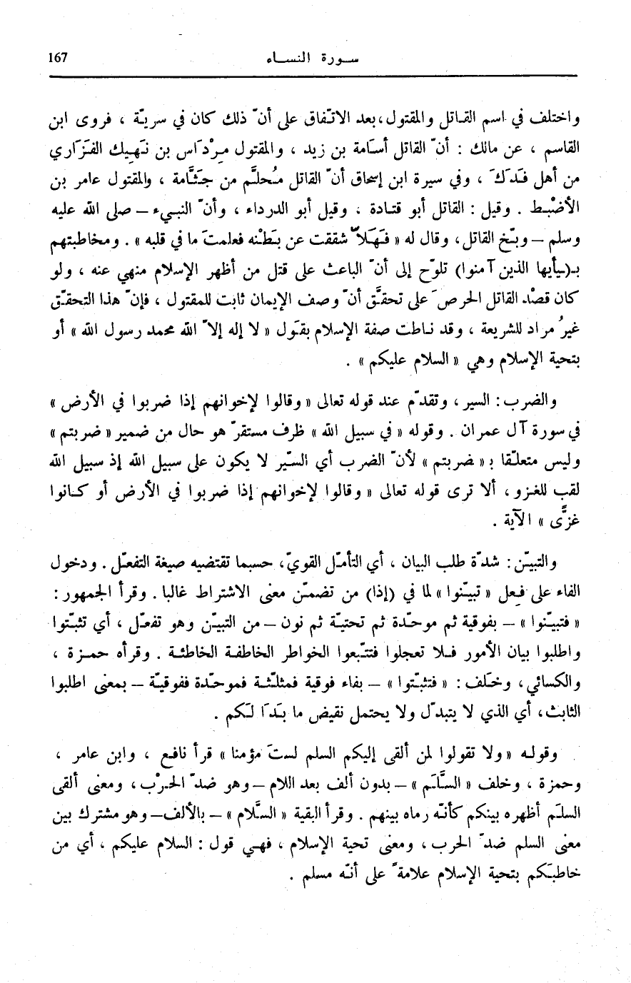 . وَمُخَاطَبَتُهُمْ بِ أَيُّهَا الَّذِينَ آمَنُوا تُلَوِّحُ إِلَى أَنَّ الْبَاعِثَ عَلَى قَتْلِ مَنْ أَظْهَرَ الْإِسْلَامَ مَنْهِيٌّ عَنْهُ، وَلَوْ كَانَ قَصْدُ الْقَاتِلِ الْحِرْصَ عَلَى تَحَقُّقِ أَنَّ وَصْفَ الْإِيمَانِ ثَابِتٌ لِلْمَقْتُولِ، فَإِنَّ هَذَا التَّحَقُّقَ غَيْرُ مُرَادٍ لِلشَّرِيعَةِ، وَقَدْ نَاطَتْ صِفَةُ الْإِسْلَامِ بِقَوْلِ: «لَا إِلَهَ إِلَّا اللَّهُ مُحَمَّدٌ رَسُولُ اللَّهِ» أَوْ بِتَحِيَّةِ الْإِسْلَامِ وَهِيَ «السَّلَامُ عَلَيْكُمْ» .