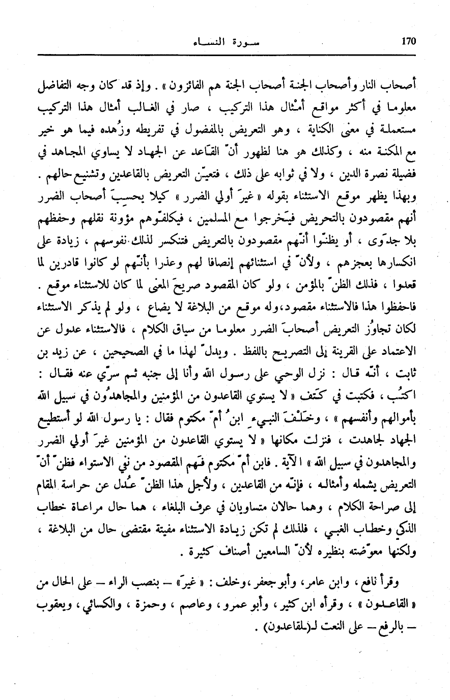 وَزُهْدِهِ فِيمَا هُوَ خَيْرٌ مَعَ الْمُكْنَةِ مِنْهُ، وَكَذَلِكَ هُوَ هُنَا لِظُهُورِ أَنَّ الْقَاعِدَ عَنِ الْجِهَادِ لَا يُسَاوِي الْمُجَاهِدَ فِي فَضِيلَةِ نُصْرَةِ الدِّينِ، وَلَا فِي ثَوَابِهِ عَلَى ذَلِكَ، فَتَعَيَّنَ التَّعْرِيضُ بِالْقَاعِدِينَ وَتَشْنِيعُ حَالِهِمْ. وَبِهَذَا يَظْهَرُ مَوْقِعُ الِاسْتِثْنَاءِ بِقَوْلِهِ: غَيْرُ أُولِي الضَّرَرِ كَيْلَا يَحْسَبَ أَصْحَابُ الضَّرَرِ أَنَّهُمْ مَقْصُودُونَ بِالتَّحْرِيضِ فَيَخْرُجُوا مَعَ الْمُسْلِمِينَ، فَيُكَلِّفُوهُمْ مَؤُونَةَ نَقْلِهِمْ وَحِفْظِهِمْ بِلَا جَدْوَى، أَوْ يَظُنُّوا أَنَّهُمْ مَقْصُودُونَ بِالتَّعْرِيضِ فَتَنْكَسِرُ لِذَلِكَ نُفُوسُهُمْ، زِيَادَةً عَلَى انْكِسَارِهَا بِعَجْزِهِمْ، وَلِأَنَّ فِي اسْتِثْنَائِهِمْ إِنْصَافًا لَهُمْ وَعُذْرًا بِأَنَّهُمْ لَوْ كَانُوا قَادِرِينَ لَمَا قَعَدُوا، فَذَلِكَ الظَّنُّ بِالْمُؤْمِنِ، وَلَوْ كَانَ الْمَقْصُودُ صَرِيحَ الْمَعْنَى لَمَا كَانَ لِلِاسْتِثْنَاءِ مَوْقِعٌ. فَاحْفَظُوا هَذَا فَالِاسْتِثْنَاءُ مَقْصُودٌ، وَلَهُ مَوْقِعٌ من البلاغة لايضاع، وَلَوْ لَمْ يُذْكَرُ الِاسْتِثْنَاءُ لَكَانَ تَجَاوُزُ التَّعْرِيضِ أَصْحَاب الضَّرَر مَعْلُومَات فِي سِيَاقِ الْكَلَامِ فَالِاسْتِثْنَاءُ عُدُولٌ عَنِ الِاعْتِمَادِ عَلَى الْقَرِينَةِ إِلَى التَّصْرِيحِ بِاللَّفْظِ. وَيَدُلُّ لِهَذَا مَا