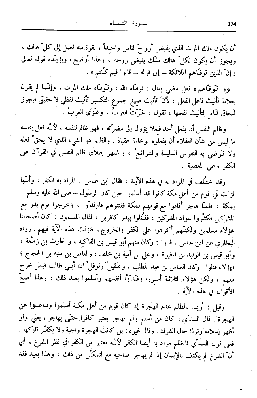 وَقِيلَ: أُرِيدَ بِالظُّلْمِ عَدَمُ الْهِجْرَةِ إِذْ كَانَ قَوْمٌ مِنْ أَهْلِ مَكَّةَ أَسْلَمُوا وَتَقَاعَسُوا عَنِ الْهِجْرَةِ. قَالَ السُّدِّيُّ: كَانَ مَنْ أَسْلَمَ وَلَمْ يُهَاجِرْ يُعْتَبَرُ كَافِرًا حَتَّى يُهَاجِرَ، يَعْنِي وَلَوْ أَظْهَرَ إِسْلَامَهُ وَتَرَكَ حَالَ الشِّرْكِ. وَقَالَ غَيْرُهُ: بَلْ كَانَتِ الْهِجْرَةُ وَاجِبَةً وَلَا يَكْفُرُ تَارِكُهَا. فَعَلَى قَوْلِ السُّدِّيِّ فَالظُّلْمُ مُرَادٌ بِهِ أَيْضًا الْكُفْرُ لِأَنَّهُ مُعْتَبَرٌ مِنَ الْكُفْرِ فِي نَظَرِ الشَّرْعِ، أَيْ أَنَّ الشَّرْعَ لَمْ يَكْتَفِ بِالْإِيمَانِ إِذَا لَمْ يُهَاجِرْ صَاحِبُهُ مَعَ التَّمَكُّنِ مِنْ ذَلِكَ، وَهَذَا بِعِيدٌ فَقَدْ