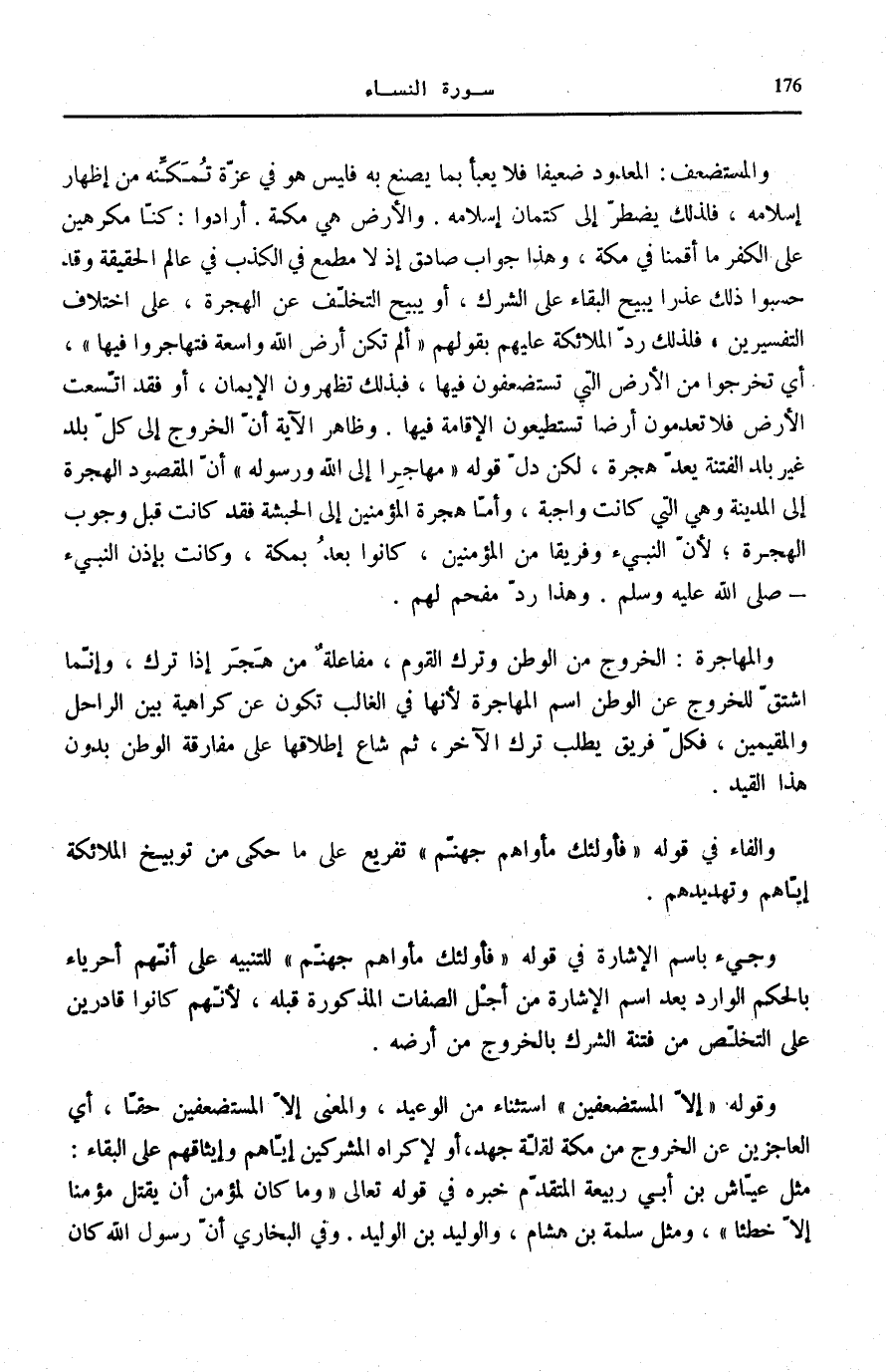 وَالْمُسْتَضْعَفُ: الْمَعْدُودُ ضَعِيفًا فَلَا يَعْبَأُ بِمَا يُصْنَعُ بِهِ فَلَيْسَ هُوَ فِي عِزَّةٍ تُمَكِّنُهُ مِنْ إِظْهَارِ إِسْلَامِهِ، فَلِذَلِكَ يَضْطَرُّ إِلَى كِتْمَانِ إِسْلَامِهِ. وَالْأَرْضُ هِيَ مَكَّةُ. أَرَادُوا: كُنَّا مُكْرَهِينَ عَلَى الْكُفْرِ مَا أَقَمْنَا فِي مَكَّةَ، وَهَذَا جَوَابٌ صَادِقٌ إِذْ لَا مَطْمَعَ فِي الْكَذِبِ فِي عَالَمِ الْحَقِيقَةِ وَقَدْ حَسِبُوا ذَلِكَ عُذْرًا يُبِيحُ الْبَقَاءَ عَلَى الشِّرْكِ، أَوْ يُبِيحُ التَّخَلُّفَ عَنِ الْهِجْرَةِ، عَلَى اخْتِلَافِ التَّفْسِيرَيْنِ، فَلِذَلِكَ رَدَّ الْمَلَائِكَةُ عَلَيْهِمْ بِقَوْلِهِمْ: أَلَمْ تَكُنْ أَرْضُ اللَّهِ واسِعَةً فَتُهاجِرُوا فِيها، أَيْ تَخْرُجُوا مِنَ الْأَرْضِ الَّتِي تُسْتَضْعَفُونَ فِيهَا، فَبِذَلِكَ تُظْهِرُونَ الْإِيمَانَ، أَوْ فَقَدِ اتَّسَعَتِ الْأَرْضُ فَلَا تَعْدَمُونَ أَرْضًا تَسْتَطِيعُونَ الْإِقَامَةَ فِيهَا. وَظَاهِرُ الْآيَةِ أَنَّ الْخُرُوجَ إِلَى كُلِّ بَلَدٍ غَيْرِ بَلَدِ الْفِتْنَةِ يُعَدُّ هِجْرَةً، لَكِنْ دَلَّ قَوْلُهُ: مُهاجِراً إِلَى اللَّهِ وَرَسُولِهِ [النِّسَاء: 100] أَنَّ الْمَقْصُودَ الْهِجْرَةُ إِلَى الْمَدِينَةِ وَهِيَ الَّتِي كَانَتْ وَاجِبَةً، وَأَمَّا هِجْرَةُ الْمُؤْمِنِينَ إِلَى الْحَبَشَةِ فَقَدْ كَانَتْ قَبْلَ وُجُوبِ الْهِجْرَةِ لِأَنَّ النَّبِيءَ وَفَرِيقًا مِنَ الْمُؤْمِنِينَ، كَانُوا بَعْدُ بِمَكَّةَ، وَكَانَتْ بِإِذْنِ النَّبِيءِ صَلَّى اللهُ عَلَيْهِ وَسَلَّمَ، وَهَذَا رَدٌّ مُفْحِمٌ لَهُمْ.