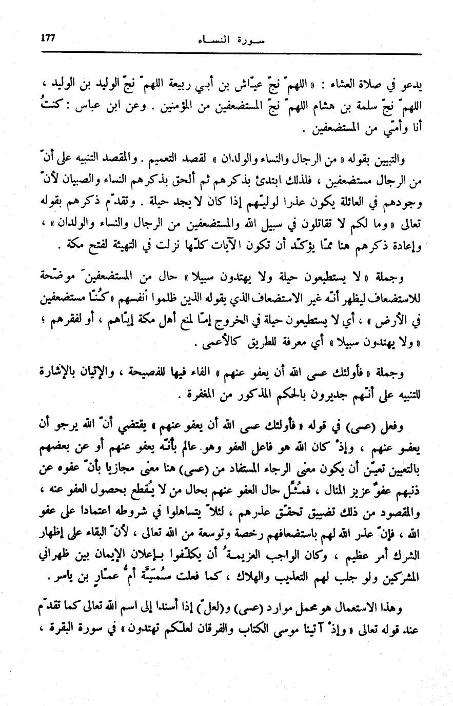 وَفِعْلُ عَسَى فِي قَوْلِهِ: فَأُولئِكَ عَسَى اللَّهُ أَنْ يَعْفُوَ عَنْهُمْ يَقْتَضِي أَنَّ اللَّهَ يَرْجُو أَنْ يَعْفُوَ عَنْهُمْ، وَإِذْ كَانَ اللَّهُ هُوَ فَاعِلُ الْعَفْوِ وَهُوَ عَالِمٌ بِأَنَّهُ يَعْفُو عَنْهُمْ أَوْ عَنْ بَعْضِهِمْ بِالتَّعْيِينِ تَعَيَّنَ أَنْ يَكُونَ مَعْنَى الرَّجَاءِ الْمُسْتَفَادِ مِنْ عَسَى هُنَا مَعْنًى مَجَازِيًّا بِأَنَّ عَفْوَهُ عَنْ ذَنْبِهِمْ عَفْوٌ عَزِيزُ الْمَنَالِ، فَمُثِّلَ حَالُ الْعَفْوِ عَنْهُمْ بِحَالِ مَنْ لَا يُقْطَعُ بِحُصُولِ الْعَفْوِ عَنْهُ، وَالْمَقْصُودُ مِنْ ذَلِكَ تَضْيِيقُ تَحَقُّقِ عُذْرِهِمْ، لِئَلَّا يَتَسَاهَلُوا فِي شُرُوطِهِ اعْتِمَادًا عَلَى عَفْوِ اللَّهِ، فَإِنَّ عُذْرَ اللَّهِ لَهُمْ بِاسْتِضْعَافِهِمْ رُخْصَةٌ وَتَوْسِعَةٌ مِنَ اللَّهِ تَعَالَى، لِأَنَّ الْبَقَاءَ عَلَى إِظْهَارِ الشِّرْكِ أَمْرٌ عَظِيمٌ، وَكَانَ الْوَاجِبُ الْعَزِيمَةُ أَنْ يُكَلَّفُوا بِإِعْلَانِ الْإِيمَانِ بَيْنَ ظَهْرَانَيِ الْمُشْرِكِينَ وَلَوْ جَلَبَ لَهُمُ التَّعْذِيبَ وَالْهَلَاكَ، كَمَا فَعَلَتْ سُمَيَّةُ أُمُّ عَمَّارِ بْنِ يَاسِرٍ.