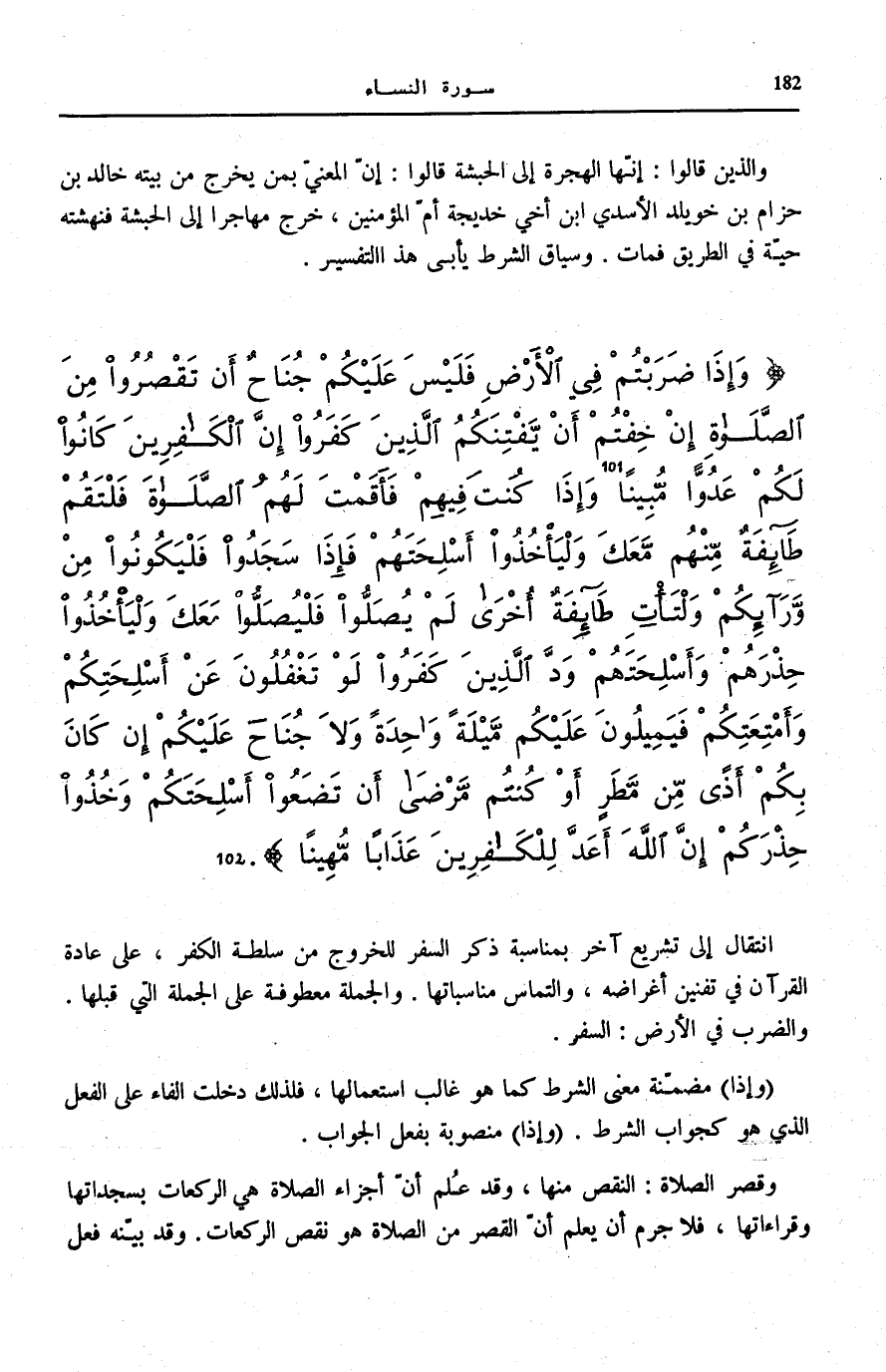 وَإِذا ضَرَبْتُمْ فِي الْأَرْضِ فَلَيْسَ عَلَيْكُمْ جُناحٌ أَنْ تَقْصُرُوا مِنَ الصَّلاةِ إِنْ خِفْتُمْ أَنْ يَفْتِنَكُمُ الَّذِينَ كَفَرُوا إِنَّ الْكافِرِينَ كانُوا لَكُمْ عَدُوًّا مُبِيناً (101) وَإِذا كُنْتَ فِيهِمْ فَأَقَمْتَ لَهُمُ الصَّلاةَ فَلْتَقُمْ طائِفَةٌ مِنْهُمْ مَعَكَ وَلْيَأْخُذُوا أَسْلِحَتَهُمْ فَإِذا سَجَدُوا فَلْيَكُونُوا مِنْ وَرائِكُمْ وَلْتَأْتِ طائِفَةٌ أُخْرى لَمْ يُصَلُّوا فَلْيُصَلُّوا مَعَكَ وَلْيَأْخُذُوا حِذْرَهُمْ وَأَسْلِحَتَهُمْ وَدَّ الَّذِينَ كَفَرُوا لَوْ تَغْفُلُونَ عَنْ أَسْلِحَتِكُمْ وَأَمْتِعَتِكُمْ فَيَمِيلُونَ عَلَيْكُمْ مَيْلَةً واحِدَةً وَلا جُناحَ عَلَيْكُمْ إِنْ كانَ بِكُمْ أَذىً مِنْ مَطَرٍ أَوْ كُنْتُمْ مَرْضى أَنْ تَضَعُوا أَسْلِحَتَكُمْ وَخُذُوا حِذْرَكُمْ إِنَّ اللَّهَ أَعَدَّ لِلْكافِرِينَ عَذاباً مُهِيناً (102)