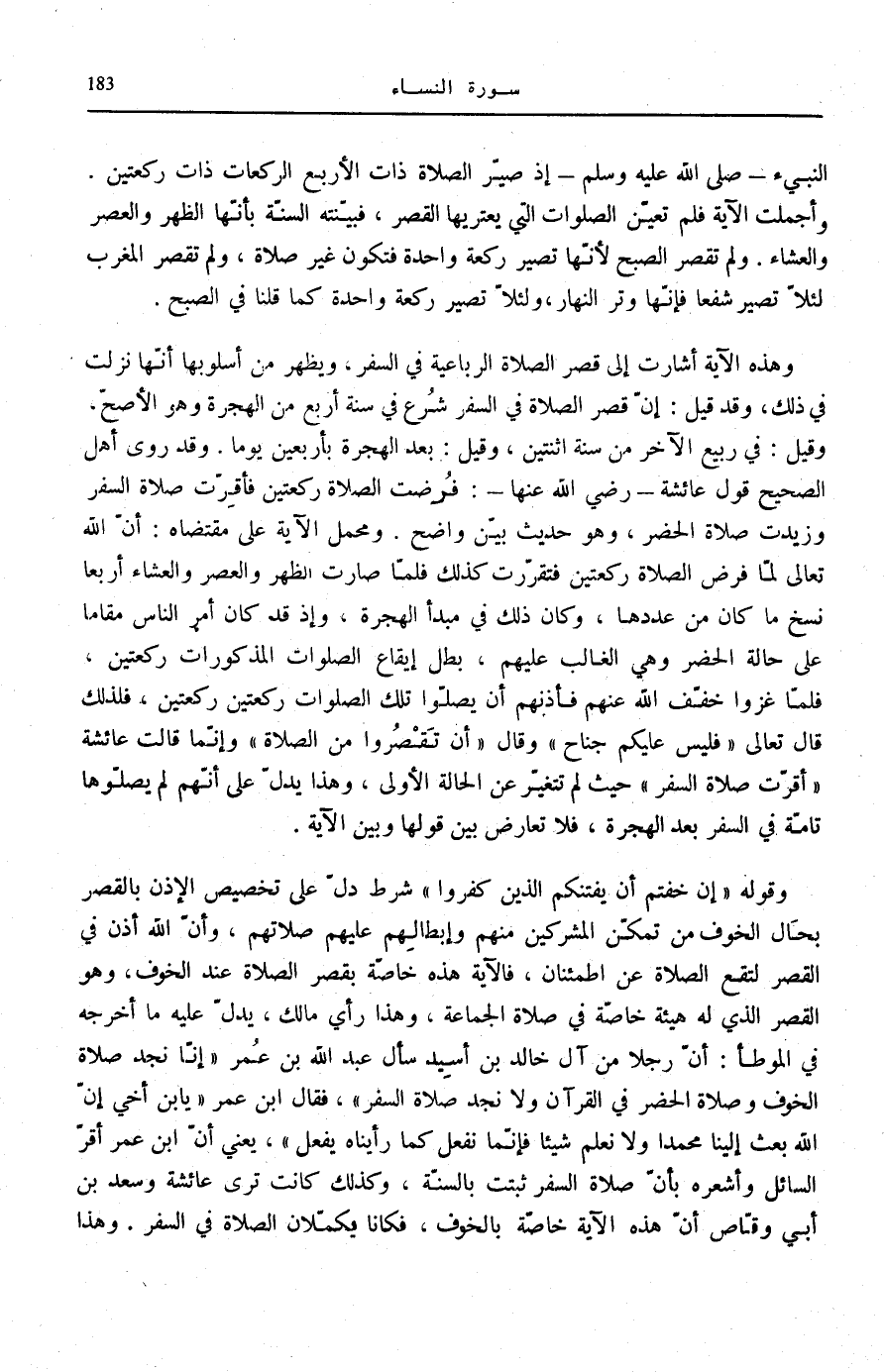 النَّبِيءِ صَلَّى اللهُ عَلَيْهِ وَسَلَّمَ إِذْ صَيَّرَ الصَّلَاةَ ذَاتَ الْأَرْبَعِ الرَّكَعَاتِ ذَاتَ رَكْعَتَيْنِ. وَأَجْمَلَتِ الْآيَةُ فَلَمْ تُعَيِّنِ الصَّلَوَاتِ الَّتِي يَعْتَرِيهَا الْقَصْرُ، فَبَيَّنَتْهُ السُّنَّةُ بِأَنَّهَا الظُّهْرُ وَالْعَصْرُ وَالْعِشَاءُ. وَلَمْ تَقْصُرِ الصُّبْحَ لِأَنَّهَا تَصِيرُ رَكْعَةً وَاحِدَةً فَتَكُونُ غَيْرَ صَلَاةٍ، وَلَمْ تَقْصُرِ الْمَغْرِبَ لِئَلَّا تَصِيرَ شَفْعًا فَإِنَّهَا وِتْرُ النَّهَارِ، وَلِئَلَّا تَصِيرَ رَكْعَةً وَاحِدَةً كَمَا قُلْنَا فِي الصُّبْحِ.