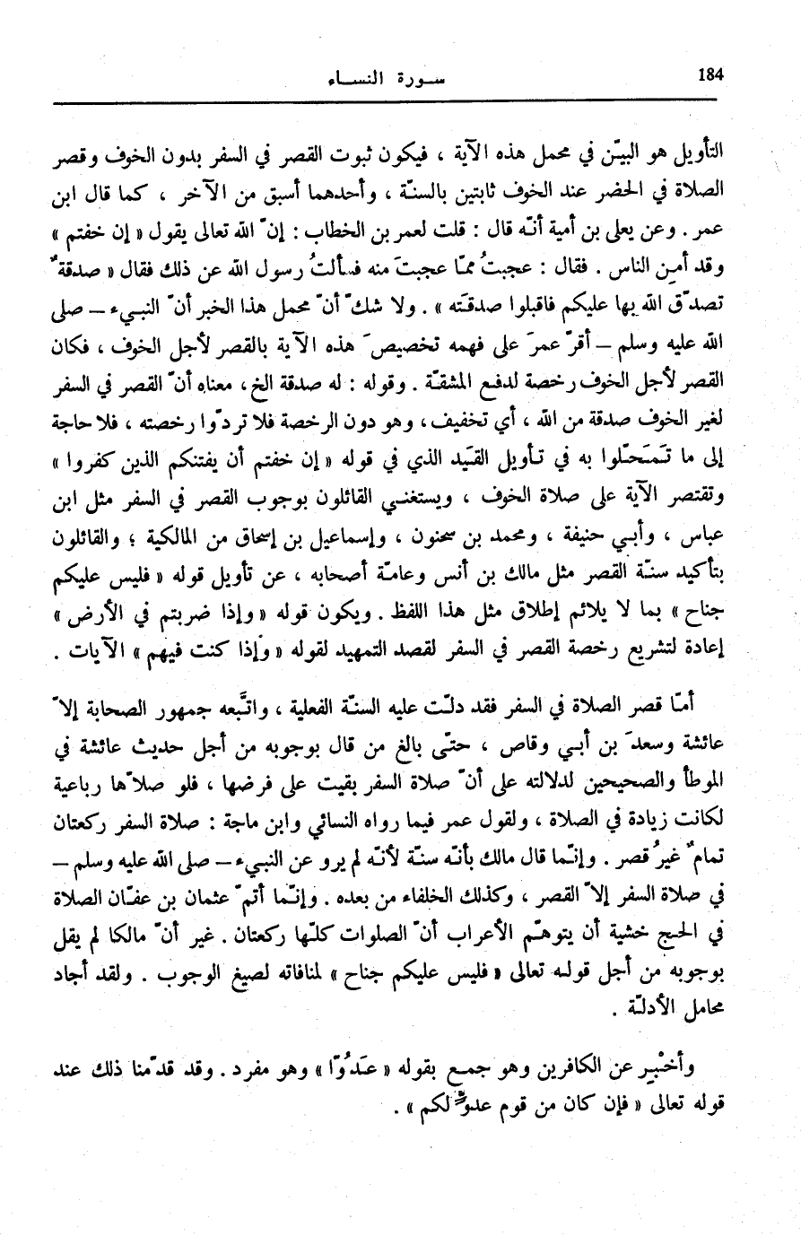 التَّأْوِيلُ هُوَ الْبَيِّنُ فِي مَحْمَلِ هَذِهِ الْآيَةِ، فَيَكُونُ ثُبُوتُ الْقَصْرِ فِي السَّفَرِ بِدُونِ الْخَوْفِ وَقَصْرُ الصَّلَاةِ فِي الْحَضَرِ عِنْدَ الْخَوْفِ ثَابِتَيْنِ بِالسُّنَّةِ، وَأَحَدُهُمَا أَسْبَقُ مِنَ الْآخَرِ، كَمَا قَالَ ابْنُ عُمَرَ.