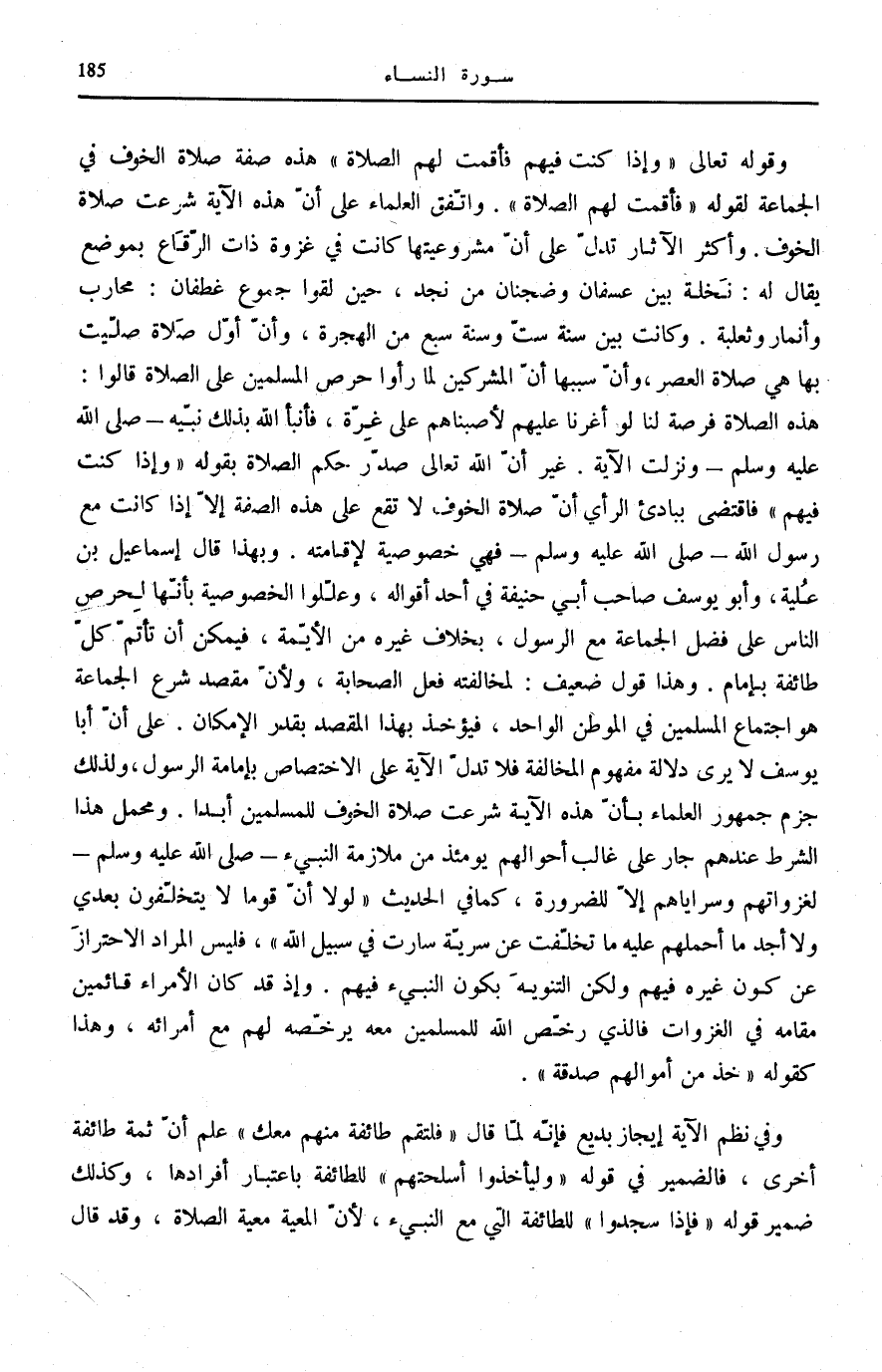 وَكَانَتْ بَيْنَ سَنَةِ سِتٍّ وَسَنَةِ سَبْعٍ مِنَ الْهِجْرَةِ، وَأَنَّ أَوَّلَ صَلَاةٍ صُلِّيَتْ بِهَا هِيَ صَلَاةُ الْعَصْرِ، وَأَنَّ سَبَبَهَا أَنَّ الْمُشْرِكِينَ لَمَّا رَأَوْا حِرْصَ الْمُسْلِمِينَ عَلَى الصَّلَاةِ قَالُوا: هَذِهِ الصَّلَاةُ فُرْصَةٌ لَنَا لَوْ أَغَرْنَا عَلَيْهِمْ لَأَصَبْنَاهُمْ عَلَى غِرَّةٍ، فَأَنْبَأَ الله بذلك نبيّه صَلَّى اللهُ عَلَيْهِ وَسَلَّمَ وَنَزَلَتِ الْآيَةُ. غَيْرَ أَنَّ اللَّهَ تَعَالَى صَدَّرَ حُكْمَ الصَّلَاةِ بِقَوْلِهِ: وَإِذا كُنْتَ فِيهِمْ فَاقْتَضَى بِبَادِئِ الرَّأْيِ أَنَّ صَلَاةَ الْخَوْفِ لَا تَقَعُ عَلَى هَذِهِ الصِّفَةِ إِلَّا إِذَا كَانَتْ مَعَ رَسُولِ اللَّهِ صَلَّى اللهُ عَلَيْهِ وَسَلَّمَ فَهِيَ خُصُوصِيَّةٌ لِإِقَامَتِهِ.