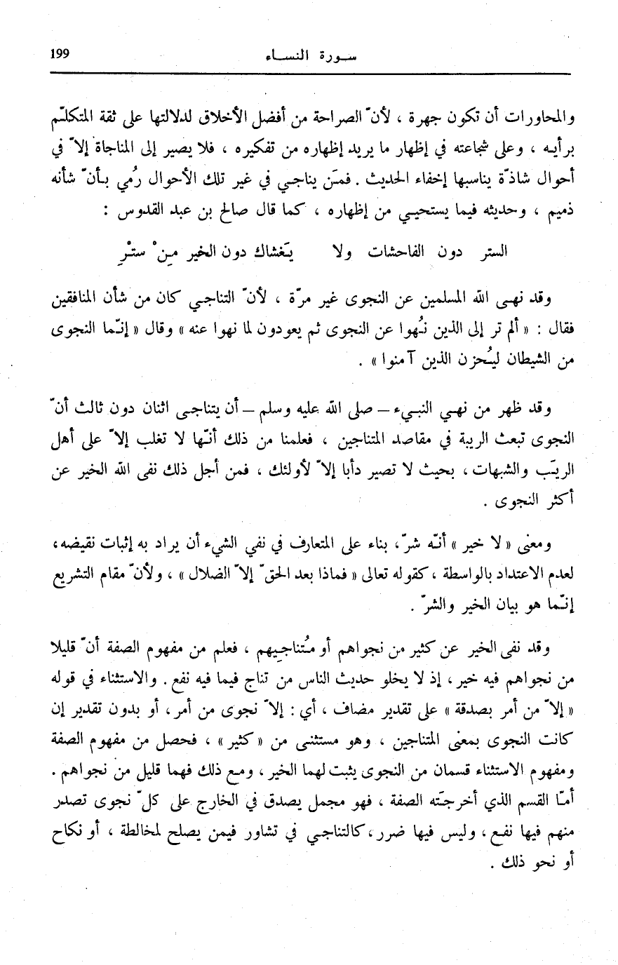 وَقَدْ ظَهَرَ مِنْ نَهْيِ النَّبِيءِ صَلَّى اللهُ عَلَيْهِ وَسَلَّمَ أَنْ يَتَنَاجَى اثْنَانِ دُونَ ثَالِثٍ أَنَّ النَّجْوَى تَبْعَثُ الرِّيبَةَ فِي مَقَاصِدِ الْمُتَنَاجِينَ، فَعَلِمْنَا مِنْ ذَلِكَ أَنَّهَا لَا تَغْلِبُ إِلَّا عَلَى أَهْلِ الرِّيَبِ وَالشُّبُهَاتِ، بِحَيْثُ لَا تَصِيرُ دَأْبًا إِلَّا لِأُولَئِكَ، فَمِنْ أَجْلِ ذَلِكَ نَفَى اللَّهُ الْخَيْرَ عَنْ أَكْثَرِ النَّجْوَى.