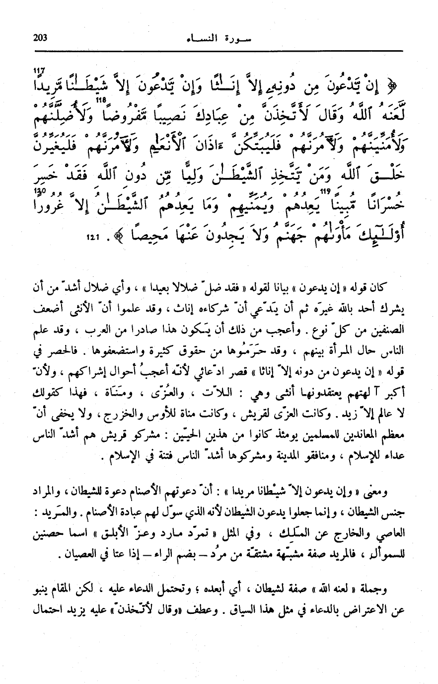 إِنْ يَدْعُونَ مِنْ دُونِهِ إِلاَّ إِناثاً وَإِنْ يَدْعُونَ إِلاَّ شَيْطاناً مَرِيداً (117) لَعَنَهُ اللَّهُ وَقالَ لَأَتَّخِذَنَّ مِنْ عِبادِكَ نَصِيباً مَفْرُوضاً (118) وَلَأُضِلَّنَّهُمْ وَلَأُمَنِّيَنَّهُمْ وَلَآمُرَنَّهُمْ فَلَيُبَتِّكُنَّ آذانَ الْأَنْعامِ وَلَآمُرَنَّهُمْ فَلَيُغَيِّرُنَّ خَلْقَ اللَّهِ وَمَنْ يَتَّخِذِ الشَّيْطانَ وَلِيًّا مِنْ دُونِ اللَّهِ فَقَدْ خَسِرَ خُسْراناً مُبِيناً (119) يَعِدُهُمْ وَيُمَنِّيهِمْ وَما يَعِدُهُمُ الشَّيْطانُ إِلاَّ غُرُوراً (120) أُولئِكَ مَأْواهُمْ جَهَنَّمُ وَلا يَجِدُونَ عَنْها مَحِيصاً (121)