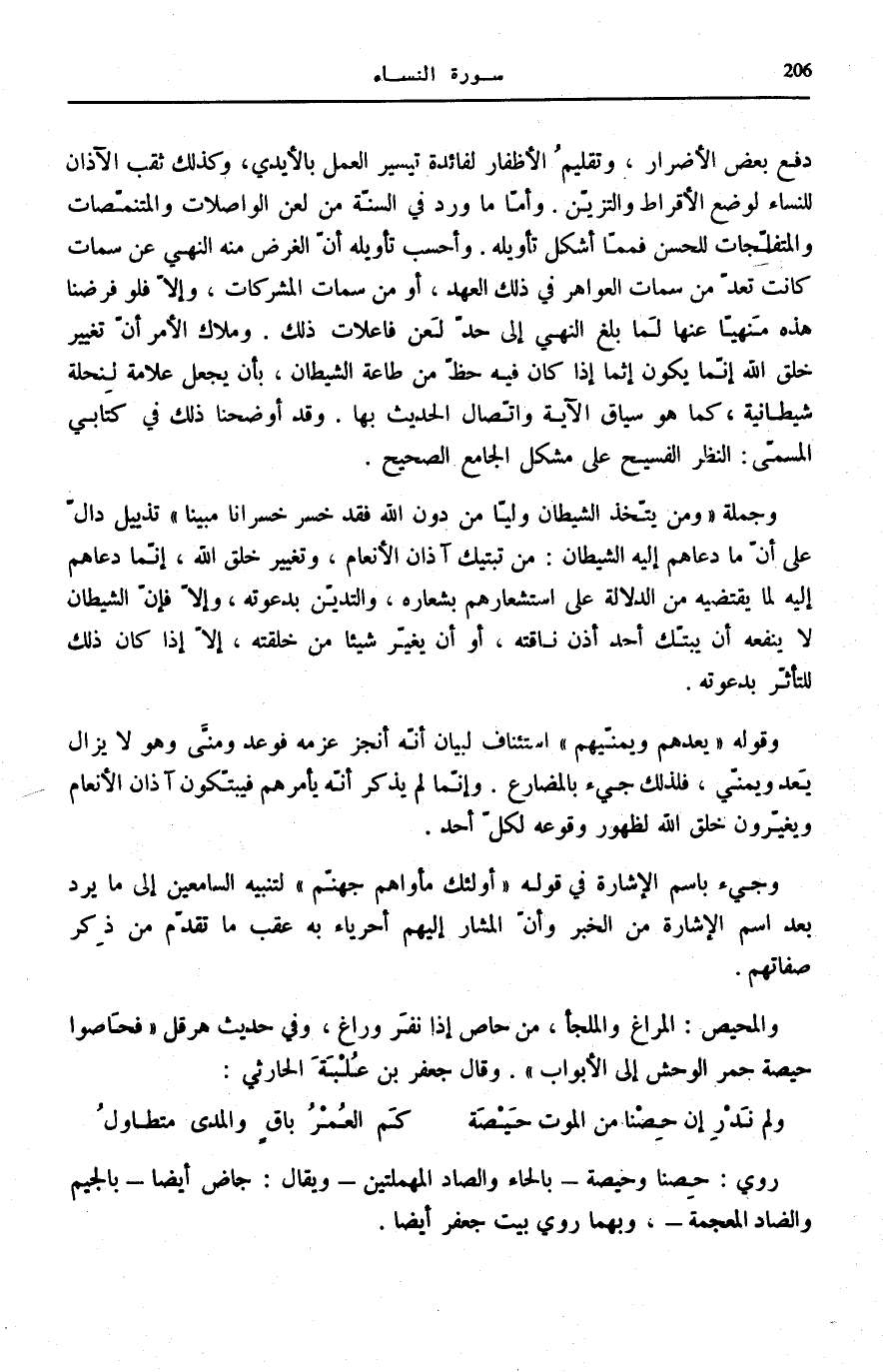 خَلْقِ اللَّهِ إنّما يكون إِنَّمَا إِذَا كَانَ فِيهِ حَظٌّ مِنْ طَاعَةِ الشَّيْطَانِ، بِأَنْ يُجْعَلَ عَلَامَةً لِنِحْلَةٍ شَيْطَانِيَّةٍ، كَمَا هُوَ سِيَاقُ الْآيَةِ وَاتِّصَالُ الْحَدِيثِ بِهَا. وَقَدْ أَوْضَحْنَا ذَلِكَ فِي كِتَابِي الْمُسَمَّى: