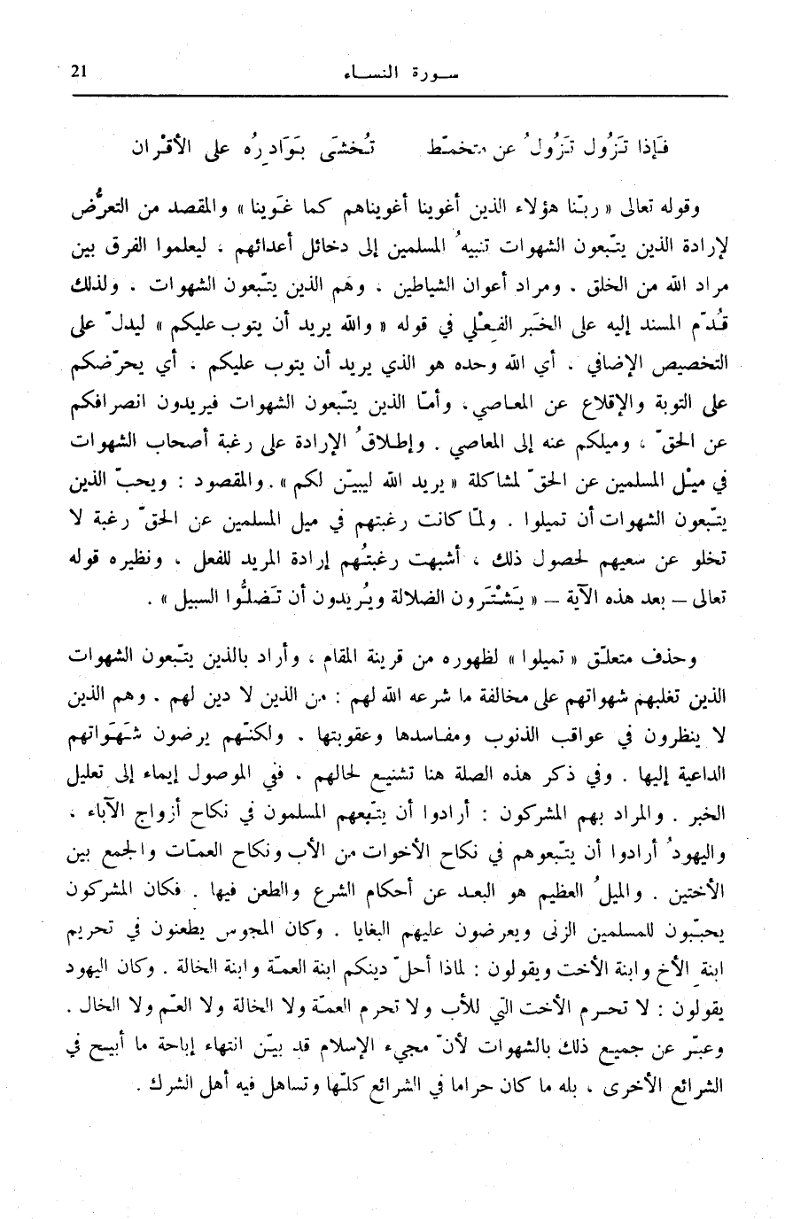 وَقَوْلِهِ تَعَالَى: رَبَّنا هؤُلاءِ الَّذِينَ أَغْوَيْنا أَغْوَيْناهُمْ كَما غَوَيْنا [الْقَصَص: 63] وَالْمَقْصِدُ مِنَ التَّعَرُّضِ لِإِرَادَةِ الَّذِينَ يَتَّبِعُونَ الشَّهَوَاتِ تَنْبِيهُ الْمُسْلِمِينَ إِلَى دَخَائِلِ أَعْدَائِهِمْ، لِيَعْلَمُوا الْفَرْقَ بَيْنَ مُرَادِ اللَّهِ مِنَ الْخَلْقِ. وَمُرَادِ أَعْوَانِ الشَّيَاطِينِ، وَهُمُ الَّذِينَ يَتَّبِعُونَ الشَّهَوَاتِ.