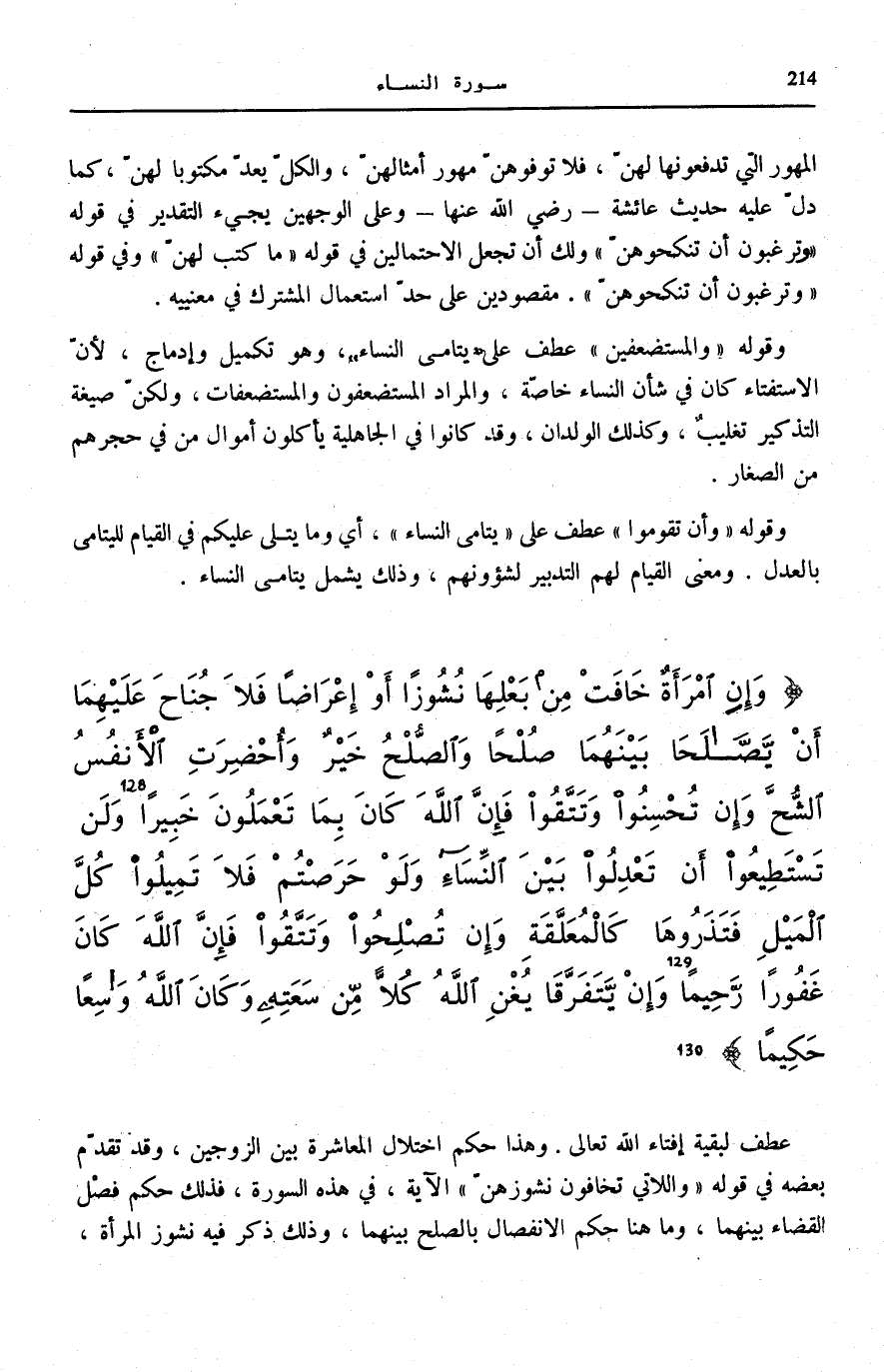 وَإِنِ امْرَأَةٌ خافَتْ مِنْ بَعْلِها نُشُوزاً أَوْ إِعْراضاً فَلا جُناحَ عَلَيْهِما أَنْ يُصْلِحا بَيْنَهُما صُلْحاً وَالصُّلْحُ خَيْرٌ وَأُحْضِرَتِ الْأَنْفُسُ الشُّحَّ وَإِنْ تُحْسِنُوا وَتَتَّقُوا فَإِنَّ اللَّهَ كانَ بِما تَعْمَلُونَ خَبِيراً (128) وَلَنْ تَسْتَطِيعُوا أَنْ تَعْدِلُوا بَيْنَ النِّساءِ وَلَوْ حَرَصْتُمْ فَلا تَمِيلُوا كُلَّ الْمَيْلِ فَتَذَرُوها كَالْمُعَلَّقَةِ وَإِنْ تُصْلِحُوا وَتَتَّقُوا فَإِنَّ اللَّهَ كانَ غَفُوراً رَحِيماً (129) وَإِنْ يَتَفَرَّقا يُغْنِ اللَّهُ كُلاًّ مِنْ سَعَتِهِ وَكانَ اللَّهُ واسِعاً حَكِيماً (130)