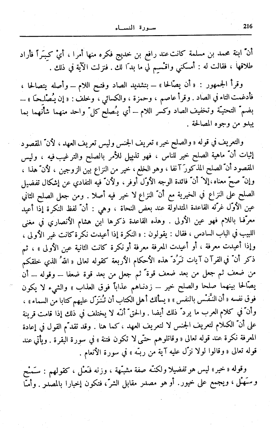 وَالتَّعْرِيفُ فِي قَوْلِهِ: وَالصُّلْحُ خَيْرٌ تَعْرِيفُ الْجِنْسِ وَلَيْسَ تَعْرِيفَ الْعَهْدِ، لِأَنَّ الْمَقْصُودَ إِثْبَاتُ أَنَّ مَاهِيَّةَ الصُّلْحِ خَيْرٌ لِلنَّاسِ، فَهُوَ تَذْيِيلٌ لِلْأَمْرِ بِالصُّلْحِ وَالتَّرْغِيبِ فِيهِ، وَلَيْسَ الْمَقْصُودُ أَنَّ الصُّلْحَ الْمَذْكُورَ آنِفًا، وَهُوَ الْخُلْعُ، خَيْرٌ مِنَ النِّزَاعِ بَيْنَ الزَّوْجَيْنِ، لِأَنَّ هَذَا، وَإِنْ صَحَّ مَعْنَاهُ، إِلَّا أَنَّ فَائِدَةَ الْوَجْهِ الْأَوَّلِ أَوْفَرُ، وَلِأَنَّ فِيهِ التَّفَادِيَ عَنْ إِشْكَالِ تَفْضِيلِ الصُّلْحِ عَلَى النِّزَاعِ فِي الْخَيْرِيَّةِ مَعَ أَنَّ النِّزَاعَ لَا خَيْرَ فِيهِ أَصْلًا. وَمَنْ جَعَلَ الصُّلْحَ