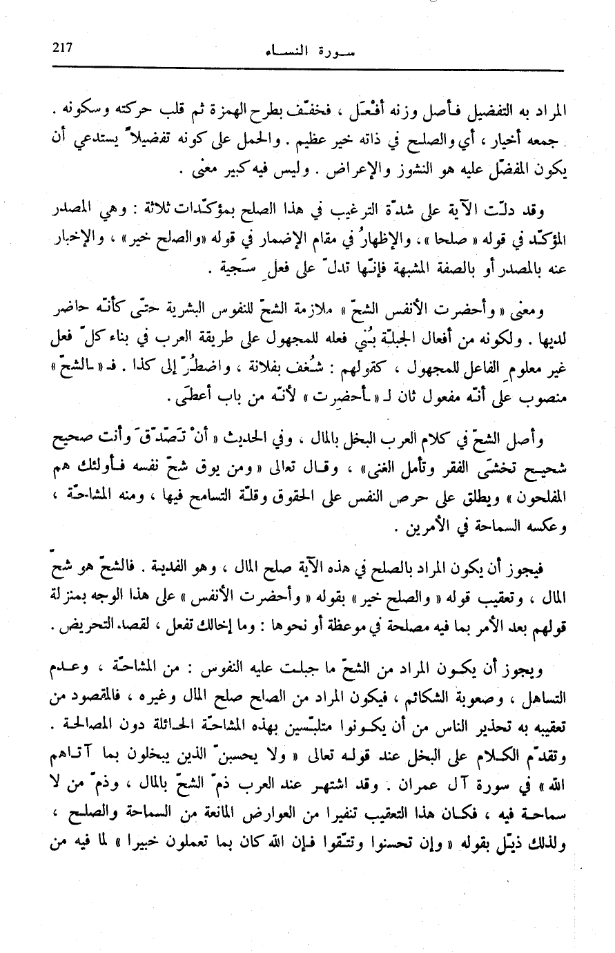 وَيَجُوزُ أَنْ يَكُونَ الْمُرَادُ مِنَ الشُّحِّ مَا جُبِلَتْ عَلَيْهِ النُّفُوسُ: مِنَ الْمُشَاحَّةِ، وَعَدَمِ التَّسَاهُلِ، وَصُعُوبَةِ الشَّكَائِمِ، فَيَكُونُ الْمُرَادُ مِنَ الصُّلْحِ صُلْحَ الْمَالِ وَغَيْرِهِ، فَالْمَقْصُودُ مِنْ تَعْقِيبِهِ بِهِ تَحْذِيرُ النَّاسِ مِنْ أَنْ يَكُونُوا مُتَلَبِّسِينَ بِهَذِهِ الْمُشَاحَّةِ الْحَائِلَةِ دُونَ الْمُصَالَحَةِ. وَتَقَدَّمَ الْكَلَامُ عَلَى الْبُخْلِ عِنْدَ قَوْلِهِ تَعَالَى: وَلا يَحْسَبَنَّ الَّذِينَ يَبْخَلُونَ بِما آتاهُمُ اللَّهُ فِي سُورَةِ آلِ عِمْرَانَ [180] . وَقَدِ اشْتُهِرَ عِنْدَ الْعَرَبِ ذَمُّ الشُّحِّ بِالْمَالِ، وَذَمُّ مَنْ لَا سَمَاحَةَ فِيهِ، فَكَانَ هَذَا التَّعْقِيبُ تَنْفِيرًا مِنَ الْعَوَارِضِ الْمَانِعَةِ مِنَ السَّمَاحَةِ وَالصُّلْحِ، وَلِذَلِكَ ذُيِّلَ بِقَوْلِهِ: وَإِنْ تُحْسِنُوا وَتَتَّقُوا فَإِنَّ اللَّهَ كانَ بِما تَعْمَلُونَ خَبِيراً لِمَا فِيهِ مِنَ