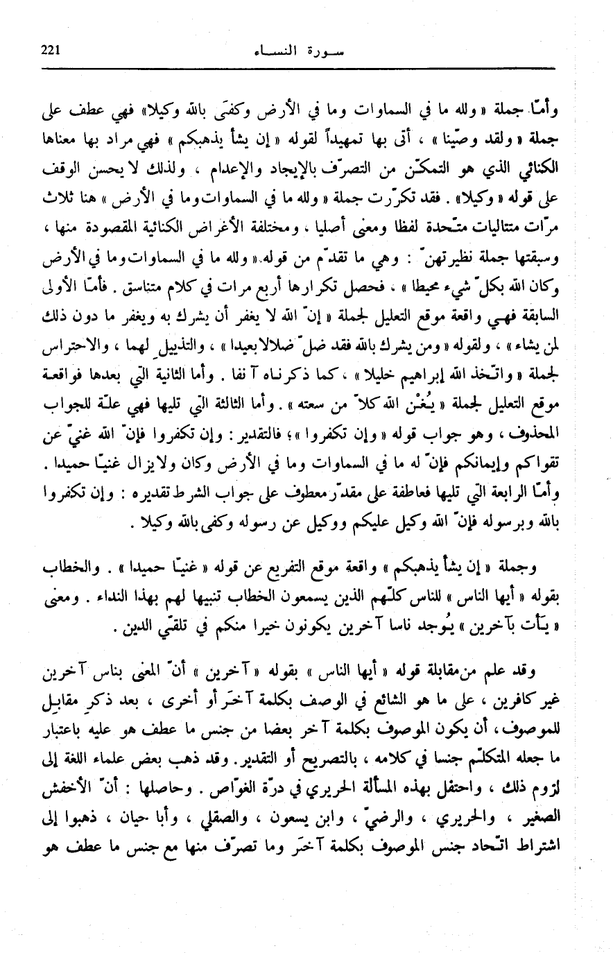 وَأَمَّا جُمْلَةُ وَلِلَّهِ مَا فِي السَّماواتِ وَما فِي الْأَرْضِ وَكَفى بِاللَّهِ وَكِيلًا فَهِيَ عَطْفٌ عَلَى جُمْلَةِ وَلَقَدْ وَصَّيْنَا، أَتَى بهَا تميهدا لِقَوْلِهِ: إِنْ يَشَأْ يُذْهِبْكُمْ فَهِيَ مُرَادٌ بِهَا مَعْنَاهَا الْكِنَائِيُّ الَّذِي هُوَ التَّمَكُّنُ مِنَ التَّصَرُّفِ بِالْإِيجَادِ وَالْإِعْدَامِ، وَلِذَلِكَ لَا يَحْسُنُ الْوَقْفُ عَلَى قَوْلِهِ: وَكِيلًا. فَقَدْ تَكَرَّرَتْ جُمْلَةُ وَلِلَّهِ مَا فِي السَّماواتِ وَما فِي الْأَرْضِ هُنَا ثَلَاثَ مَرَّاتٍ مُتَتَالِيَاتٍ مُتَّحِدَةً لَفْظًا وَمَعْنًى أَصْلِيًّا، وَمُخْتَلِفَةَ الْأَغْرَاضِ الْكِنَائِيَّةِ الْمَقْصُودَةِ مِنْهَا، وَسَبَقَتْهَا جُمْلَةٌ نَظِيرَتُهُنَّ: وَهِيَ مَا تَقَدَّمَ مِنْ قَوْلِهِ: وَلِلَّهِ مَا فِي السَّماواتِ وَما فِي الْأَرْضِ وَكانَ اللَّهُ بِكُلِّ شَيْءٍ مُحِيطاً [النِّسَاء: 126] . فَحَصَلَ تَكْرَارُهَا أَرْبَعَ مَرَّاتٍ فِي كَلَامٍ مُتَنَاسِقٍ.