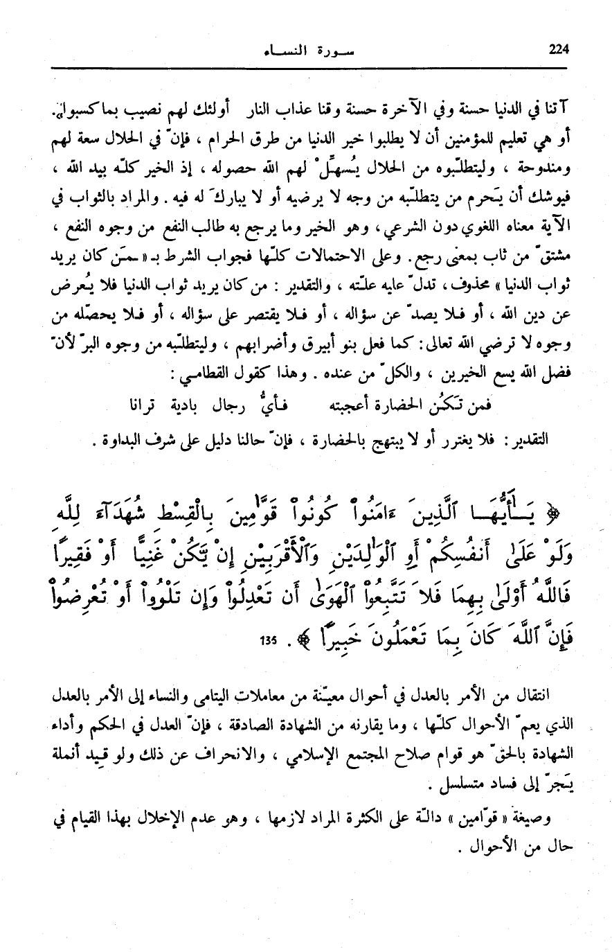 يَا أَيُّهَا الَّذِينَ آمَنُوا كُونُوا قَوَّامِينَ بِالْقِسْطِ شُهَداءَ لِلَّهِ وَلَوْ عَلى أَنْفُسِكُمْ أَوِ الْوالِدَيْنِ وَالْأَقْرَبِينَ إِنْ يَكُنْ غَنِيًّا أَوْ فَقِيراً فَاللَّهُ أَوْلى بِهِما فَلا تَتَّبِعُوا الْهَوى أَنْ تَعْدِلُوا وَإِنْ تَلْوُوا أَوْ تُعْرِضُوا فَإِنَّ اللَّهَ كانَ بِما تَعْمَلُونَ خَبِيراً (135)