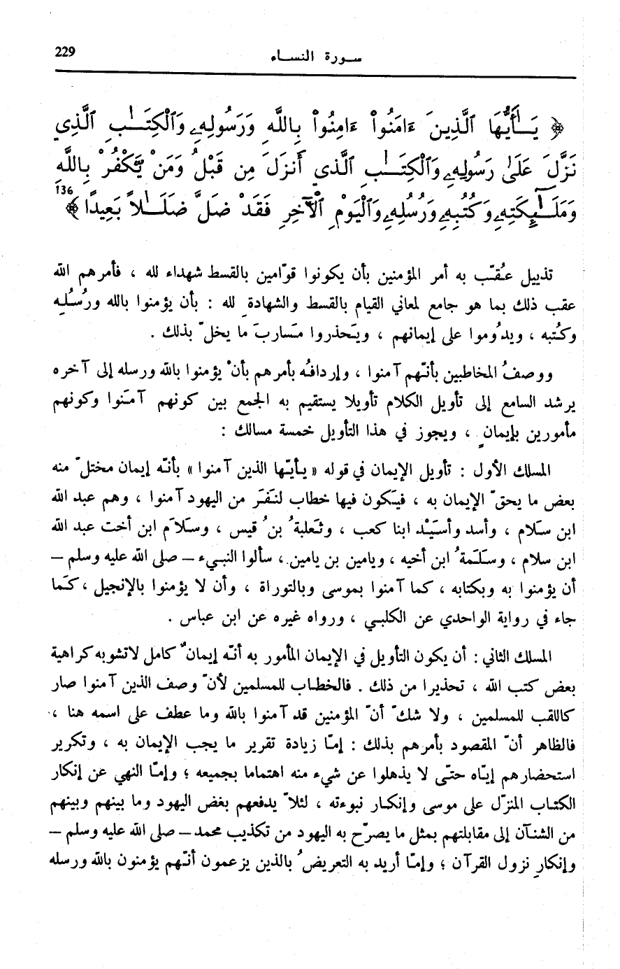 يَا أَيُّهَا الَّذِينَ آمَنُوا آمِنُوا بِاللَّهِ وَرَسُولِهِ وَالْكِتابِ الَّذِي نَزَّلَ عَلى رَسُولِهِ وَالْكِتابِ الَّذِي أَنْزَلَ مِنْ قَبْلُ وَمَنْ يَكْفُرْ بِاللَّهِ وَمَلائِكَتِهِ وَكُتُبِهِ وَرُسُلِهِ وَالْيَوْمِ الْآخِرِ فَقَدْ ضَلَّ ضَلالاً بَعِيداً (136)