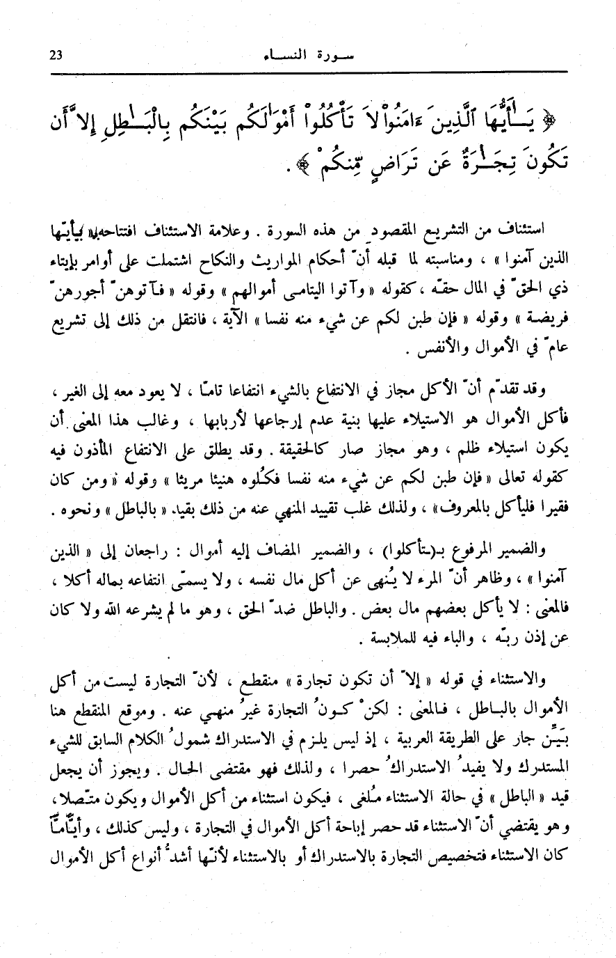 وَالِاسْتِثْنَاءُ فِي قَوْلِهِ: إِلَّا أَنْ تَكُونَ تِجارَةً مُنْقَطِعٌ، لِأَنَّ التِّجَارَةَ لَيْسَتْ مِنْ أَكْلِ الْأَمْوَالِ بِالْبَاطِلِ، فَالْمَعْنَى: لَكِنْ كَوْنُ التِّجَارَةِ غَيْرُ مَنْهِيٍّ عَنْهُ. وَمَوْقِعُ الْمُنْقَطِعِ هُنَا بَيِّنٌ جَارٍ عَلَى الطَّرِيقَةِ الْعَرَبِيَّةِ، إِذْ لَيْسَ يَلْزَمُ فِي الِاسْتِدْرَاكِ شُمُولُ الْكَلَامِ السَّابِقِ لِلشَّيْءِ الْمُسْتَدْرَكِ وَلَا يُفِيدُ الِاسْتِدْرَاكُ حَصْرًا، وَلِذَلِكَ فَهُوَ مُقْتَضَى الْحَالِ. وَيَجُوزُ أَنْ يُجْعَلَ قَيْدُ الْبَاطِلِ فِي حَالَةِ الِاسْتِثْنَاءِ مُلْغًى، فَيَكُونَ اسْتِثْنَاءً مِنْ أَكْلِ الْأَمْوَالِ وَيَكُونَ مُتَّصِلًا، وَهُوَ يَقْتَضِي أَنَّ الِاسْتِثْنَاءَ قَدْ حَصَرَ إِبَاحَةَ أَكْلِ الْأَمْوَالِ فِي التِّجَارَةِ، وَلَيْسَ كَذَلِك، وأياما كَانَ الِاسْتِثْنَاءُ فَتَخْصِيصُ التِّجَارَةِ بِالِاسْتِدْرَاكِ أَوْ بِالِاسْتِثْنَاءِ لِأَنَّهَا أَشَدُّ أَنْوَاعِ أَكْلِ الْأَمْوَالِ