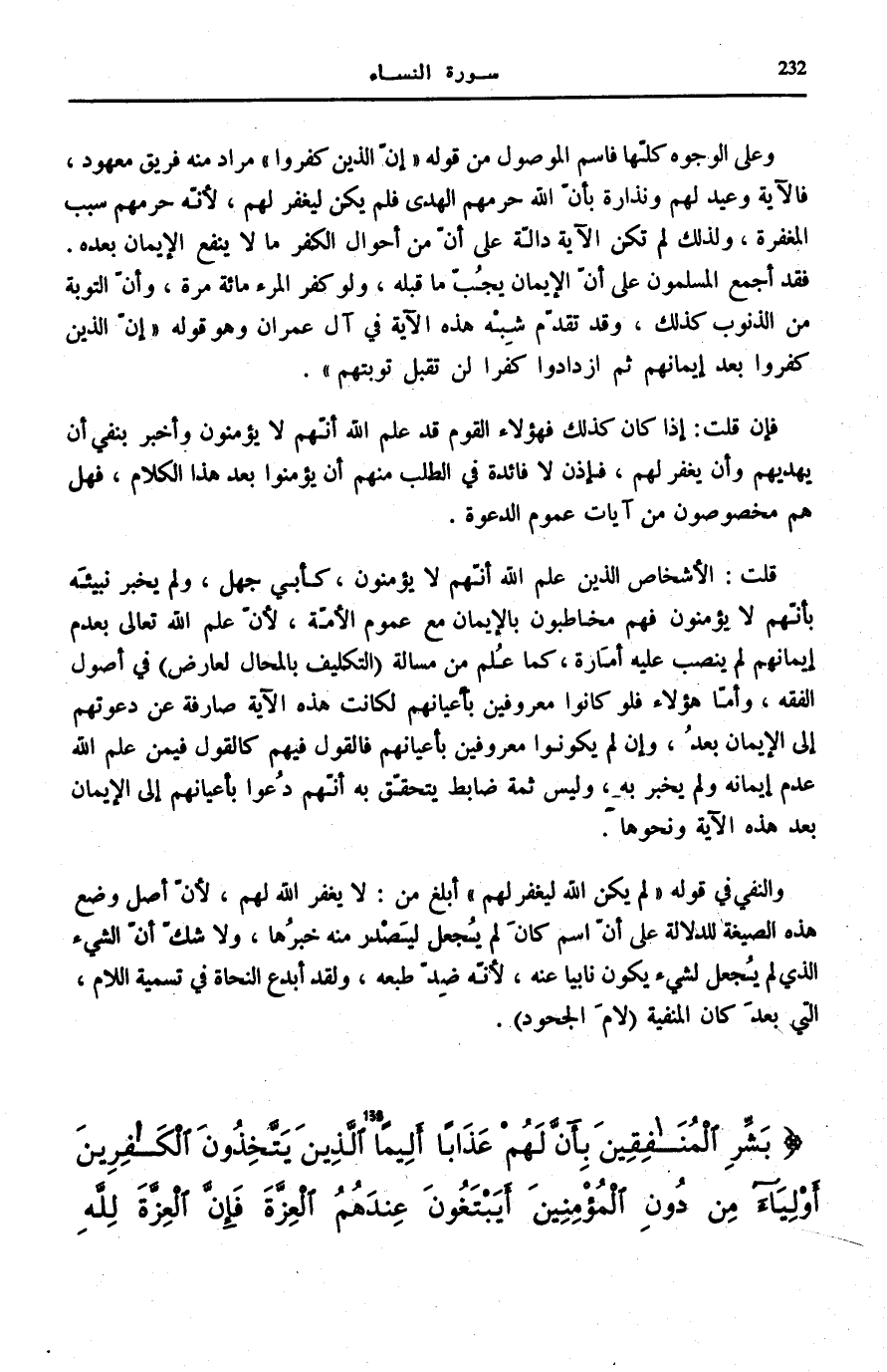 وَعَلَى الْوُجُوهِ كُلِّهَا فَاسْمُ الْمَوْصُولِ مِنْ قَوْلِهِ: إِنَّ الَّذِينَ ... كَفَرُوا مُرَادٌ مِنْهُ فَرِيقٌ مَعْهُودٌ، فَالْآيَةُ وَعِيدٌ لَهُمْ وَنِذَارَةٌ بِأَنَّ اللَّهَ حَرَمَهُمُ الْهُدَى فَلَمْ يَكُنْ لِيَغْفِرَ لَهُمْ، لِأَنَّهُ حَرَمَهُمْ سَبَبَ الْمَغْفِرَةِ، وَلِذَلِكَ لَمْ تَكُنِ الْآيَةُ دَالَّةً عَلَى أَنَّ مِنْ أَحْوَالِ الْكُفْرِ مَا لَا يَنْفَعُ الْإِيمَانُ بَعْدَهُ. فَقَدْ أَجْمَعَ الْمُسْلِمُونَ عَلَى أَنَّ الْإِيمَانَ يَجُبُّ مَا قَبْلَهُ، وَلَوْ كَفَرَ الْمَرْءُ مِائَةَ مَرَّةٍ، وَأَنَّ التَّوْبَةَ مِنَ الذُّنُوبِ كَذَلِكَ، وَقَدْ تَقَدَّمَ شِبْهُ هَذِهِ الْآيَةِ فِي آلِ عِمْرَانَ [190] وَهُوَ قَوْلُهُ: إِنَّ الَّذِينَ كَفَرُوا بَعْدَ إِيمانِهِمْ ثُمَّ ازْدادُوا كُفْراً لَنْ تُقْبَلَ تَوْبَتُهُمْ.