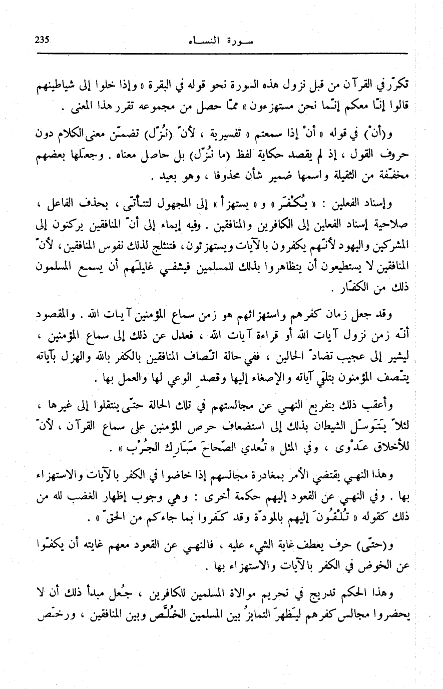 وَإِسْنَادُ الْفِعْلَيْنِ: يُكْفَرُ ويُسْتَهْزَأُ إِلَى الْمَجْهُولِ لِتَتَأَتَّى، بِحَذْفِ الْفَاعِلِ، صَلَاحِيَةُ إِسْنَادِ الْفِعْلَيْنِ إِلَى الْكَافِرِينَ وَالْمُنَافِقِينَ. وَفِيهِ إِيمَاءٌ إِلَى أَنَّ الْمُنَافِقِينَ يَرْكَنُونَ إِلَى الْمُشْرِكِينَ وَالْيَهُودِ لِأَنَّهُمْ يَكْفُرُونَ بِالْآيَاتِ وَيَسْتَهْزِئُونَ، فَتَنْثَلِجُ لِذَلِكَ نُفُوسُ الْمُنَافِقِينَ، لِأَنَّ الْمُنَافِقِينَ لَا يَسْتَطِيعُونَ أَنْ يَتَظَاهَرُوا بِذَلِكَ لِلْمُسْلِمِينَ فَيَشْفِي غَلِيلَهُمْ أَنْ يَسْمَعَ الْمُسْلِمُونَ ذَلِكَ مِنَ الْكُفَّارِ.