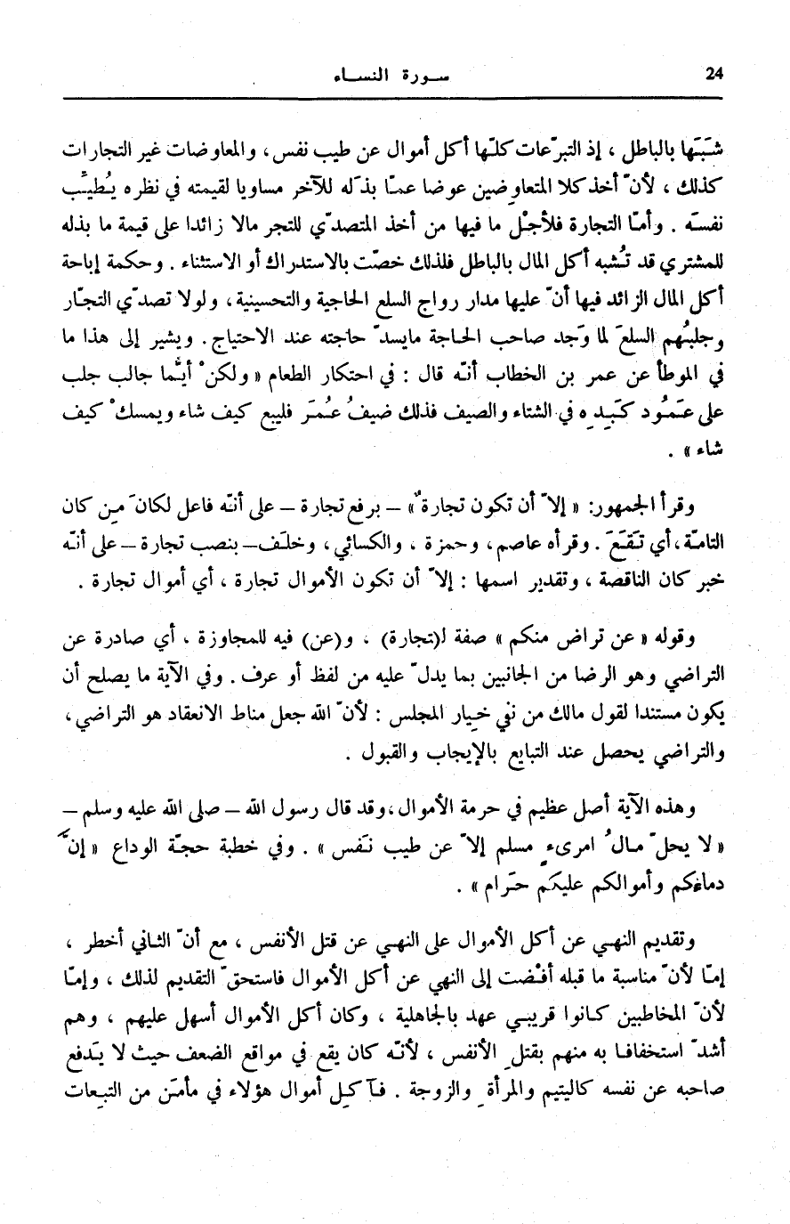 شَبَهًا بِالْبَاطِلِ، إِذِ التَّبَرُّعَاتُ كُلُّهَا أَكْلُ أَمْوَالٍ عَنْ طِيبِ نَفْسٍ، وَالْمُعَاوَضَاتُ غَيْرُ التِّجَارَاتِ كَذَلِكَ لِأَنَّ أَخْذَ كِلَا الْمُتَعَاوِضَيْنِ عِوَضًا عَمَّا بَذَلَهُ لِلْآخَرِ مُسَاوِيًا لِقِيمَتِهِ فِي نَظَرِهِ يُطَيِّبُ نَفْسَهُ. وَأَمَّا التِّجَارَةُ فَلِأَجْلِ مَا فِيهَا مِنْ أَخْذِ الْمُتَصَدِّي للتجر مَا لَا زَائِدًا عَلَى قِيمَةِ مَا بَذَلَهُ لِلْمُشْتَرِي قَدْ تُشْبِهُ أَكْلَ الْمَالِ بِالْبَاطِلِ فَلِذَلِكَ خُصَّتْ بِالِاسْتِدْرَاكِ أَوِ الِاسْتِثْنَاءِ. وَحِكْمَةُ إِبَاحَةِ أَكْلِ الْمَالِ الزَّائِدِ فِيهَا أَنَّ عَلَيْهَا مَدَارَ رَوَاجِ السّلع الحاجية والتحسينية، وَلَوْلَا تَصَدِّي التُّجَّارِ وَجَلْبُهُمُ السِّلَعَ لَمَا وَجَدَ صَاحِبُ الْحَاجَةِ مَا يَسُدُّ حَاجَتَهُ عِنْدَ الِاحْتِيَاجِ. وَيُشِيرُ إِلَى هَذَا مَا فِي «الْمُوَطَّأِ» عَنْ عُمَرَ بْنِ الْخَطَّابِ أَنَّهُ قَالَ: فِي احْتِكَارِ الطَّعَامِ «وَلَكِنْ أَيُّمَا جَالِبٍ جَلَبَ عَلَى عَمُودِ كَبِدِهِ