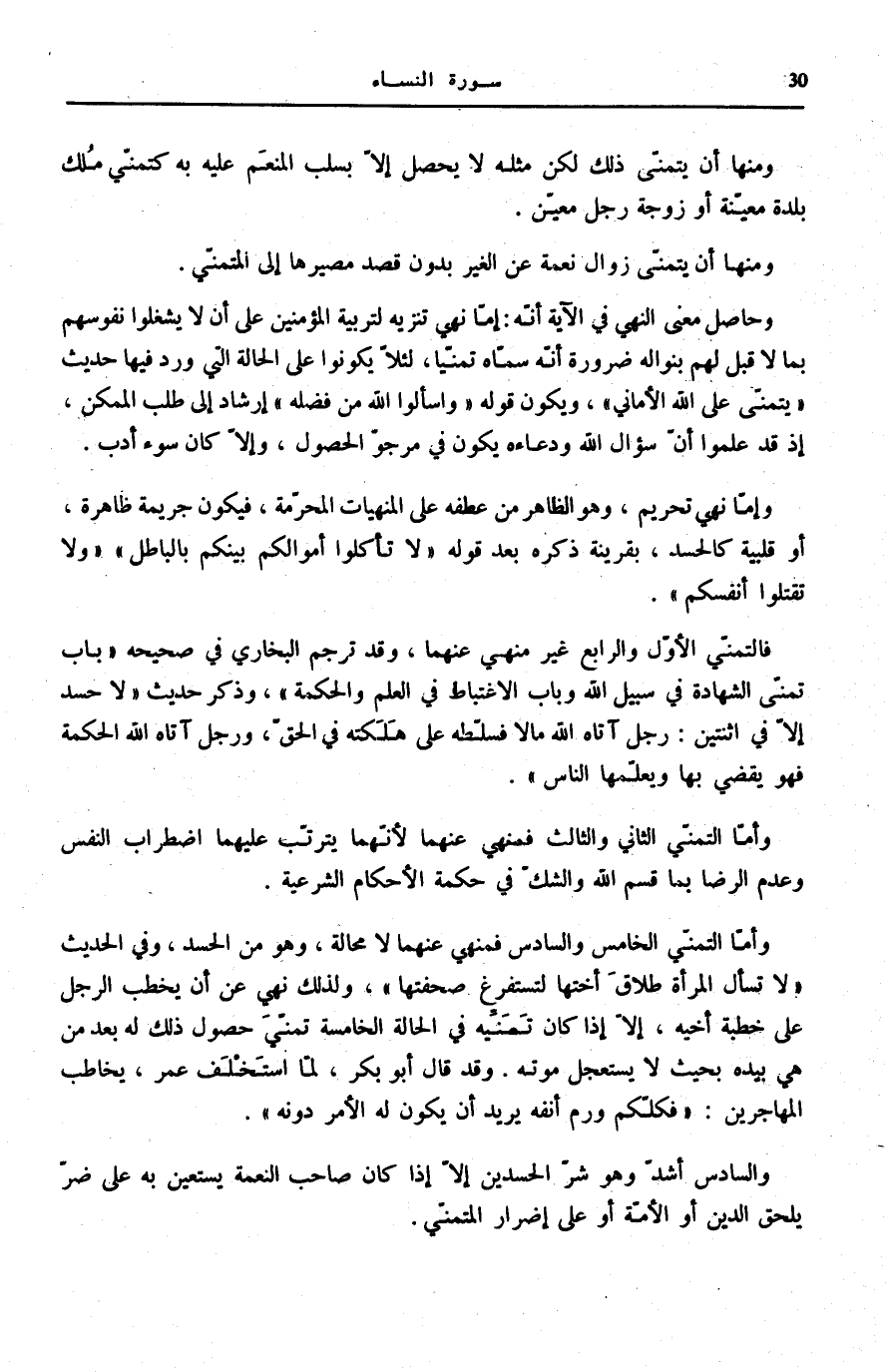 ، وَلِذَلِكَ نُهِيَ عَنْ أَنْ يَخْطِبَ الرَّجُلُ عَلَى خِطْبَةِ أَخِيه، إلّا إِذْ كَانَ تَمَنِّيهِ فِي الْحَالَةِ الْخَامِسَةِ تَمَنِّي حُصُولِ ذَلِكَ لَهُ بَعْدَ مَنْ هِيَ بِيَدِهِ بِحَيْثُ لَا يَسْتَعْجِلُ مَوْتَهُ. وَقَدْ قَالَ أَبُو بَكْرٍ، لَمَّا اسْتَخْلَفَ عُمَرَ، يُخَاطِبُ الْمُهَاجِرِينَ: «فَكُلُّكُمْ وَرِمَ أَنْفُهُ يُرِيدُ أَنْ يَكُونَ لَهُ الْأَمْرُ دُونَهُ» .