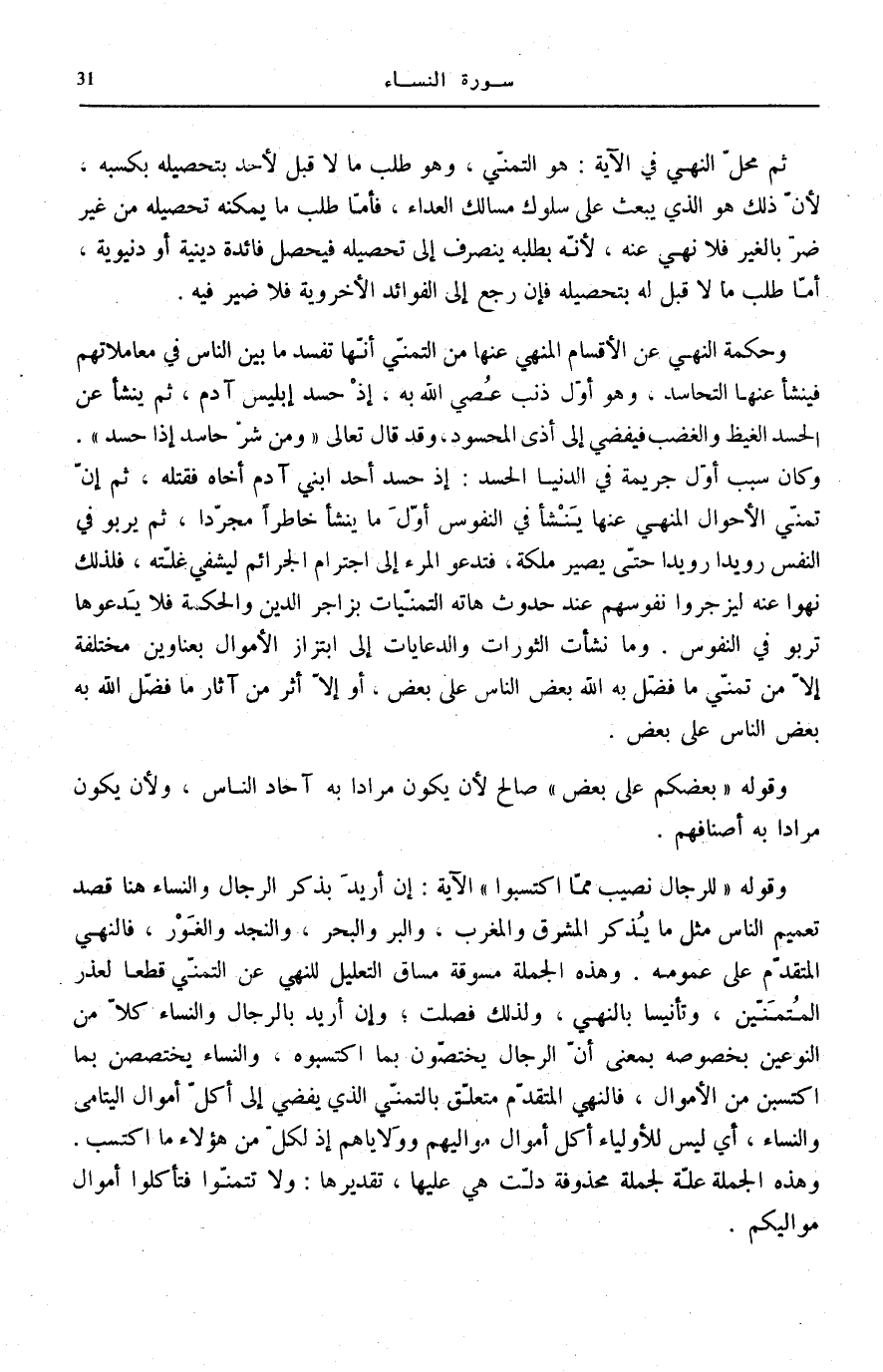 وَقَوْلُهُ: لِلرِّجالِ نَصِيبٌ مِمَّا اكْتَسَبُوا الْآيَةَ: إِنْ أُرِيدَ بِذِكْرِ الرِّجَالِ وَالنِّسَاءِ هُنَا قَصْدُ تَعْمِيمِ النَّاسِ مِثْلَ مَا يُذْكَرُ الْمَشْرِقُ وَالْمَغْرِبُ، وَالْبَرُّ وَالْبَحْرُ، وَالنَّجْدُ وَالْغَوْرُ، فَالنَّهْيُ الْمُتَقَدِّمُ عَلَى عُمُومِهِ. وَهَذِهِ الْجُمْلَةُ مَسُوقَةٌ مَسَاقَ التَّعْلِيلِ لِلنَّهْيِ عَنِ التَّمَنِّي قَطْعًا لِعُذْرِ الْمُتَمَنِّينَ، وَتَأْنِيسًا بِالنَّهْيِ، وَلِذَلِكَ فَصَّلَتْ وَإِنْ أُرِيدَ بِالرِّجَالِ وَالنِّسَاءِ كُلًّا مِنَ النَّوْعَيْنِ بِخُصُوصِهِ بِمَعْنَى أَنَّ الرِّجَالَ يَخْتَصُّونَ بِمَا اكْتَسَبُوهُ، وَالنِّسَاءَ يَخْتَصِصْنَ بِمَا اكْتَسَبْنَ مِنَ الْأَمْوَالِ، فَالنَّهْيُ الْمُتَقَدِّمُ مُتَعَلِّقٌ بِالتَّمَنِّي الَّذِي يُفْضِي إِلَى أَكْلِ أَمْوَالِ الْيَتَامَى وَالنِّسَاءِ، أَيْ لَيْسَ لِلْأَوْلِيَاءِ أَكْلُ أَمْوَالِ مَوَالِيهِمْ وَوَلَايَاهُمْ إِذْ لِكُلٍّ مِنْ هَؤُلَاءِ مَا اكْتَسَبَ. وَهَذِهِ الْجُمْلَةُ عِلَّةٌ لِجُمْلَةٍ مَحْذُوفَةٍ دَلَّتْ هِيَ عَلَيْهَا، تَقْدِيرُهَا: وَلَا تَتَمَنَّوْا فَتَأْكُلُوا أَمْوَالَ مَوَالِيكُمْ.