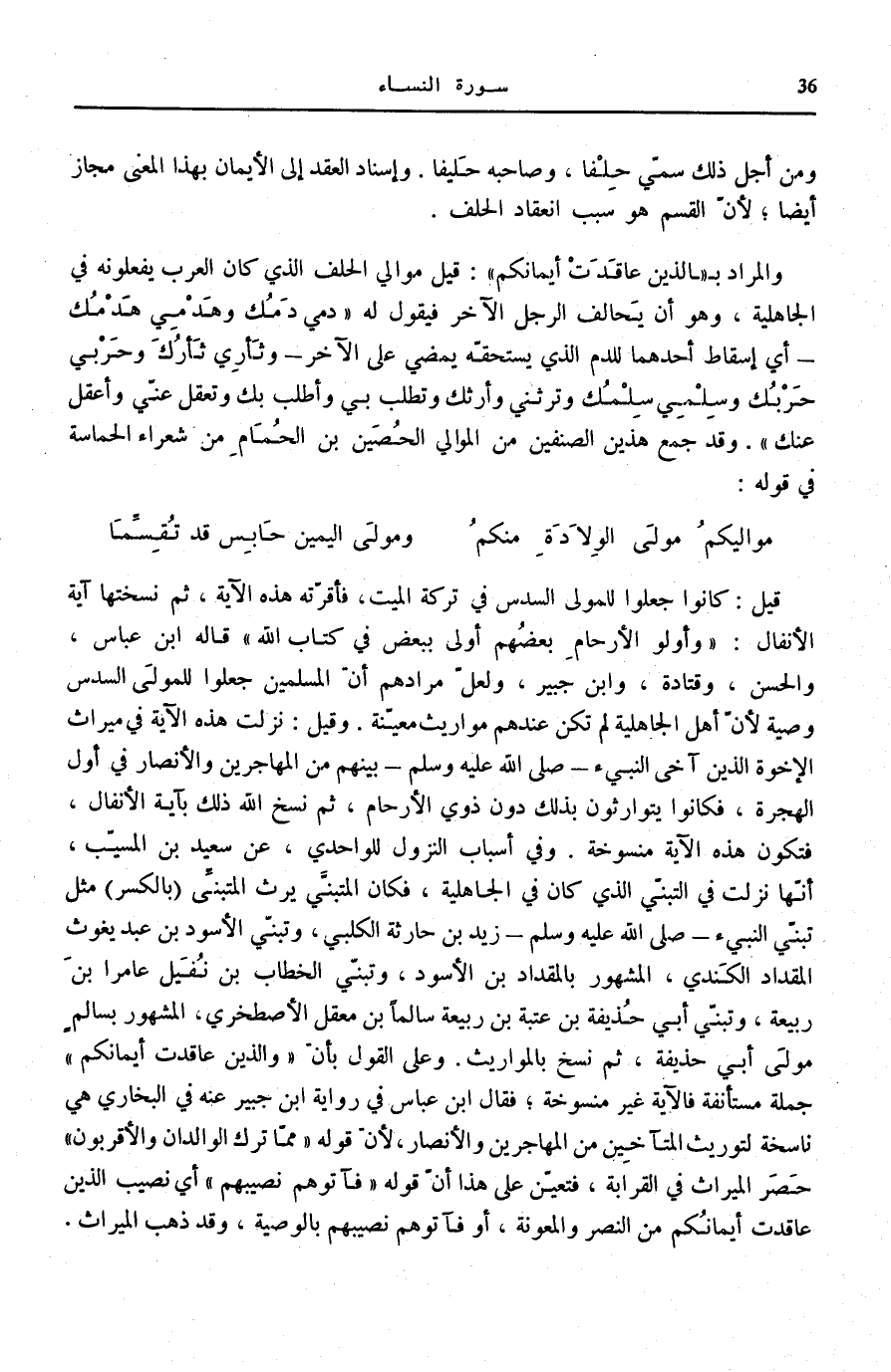 وَالْمُرَادُ ب الَّذِينَ عَقَدَتْ أَيْمانُكُمْ: قِيلَ مَوَالِي الْحِلْفِ الَّذِي كَانَ الْعَرَبُ يَفْعَلُونَهُ فِي الْجَاهِلِيَّةِ، وَهُوَ أَنْ يُحَالِفَ الرَّجُلُ الْآخَرَ فَيَقُولُ لَهُ «دَمِي دَمُكَ وَهَدْمِي هَدْمُكَ- أَيْ إِسْقَاطُ أَحَدِهِمَا لِلدَّمِ الَّذِي يَسْتَحِقُّهُ يَمْضِي عَلَى الْآخَرِ- وَثَأْرِي ثَأْرُكَ وَحَرْبِي حَرْبُكَ وَسِلْمِي سِلْمُكَ وَتَرِثُنِي وَأَرِثُكَ وَتَطْلُبُ بِي وَأَطْلُبُ بِكَ وَتَعْقِلُ عَنِّي وَأَعْقِلُ عَنْكَ» . وَقَدْ جَمَعَ هَذَيْنِ الصِّنْفَيْنِ مِنَ الْمَوَالِي الْحُصَيْنُ بْنُ الْحُمَامِ مِنْ شُعَرَاءِ الْحَمَاسَةِ فِي قَوْلِهِ: