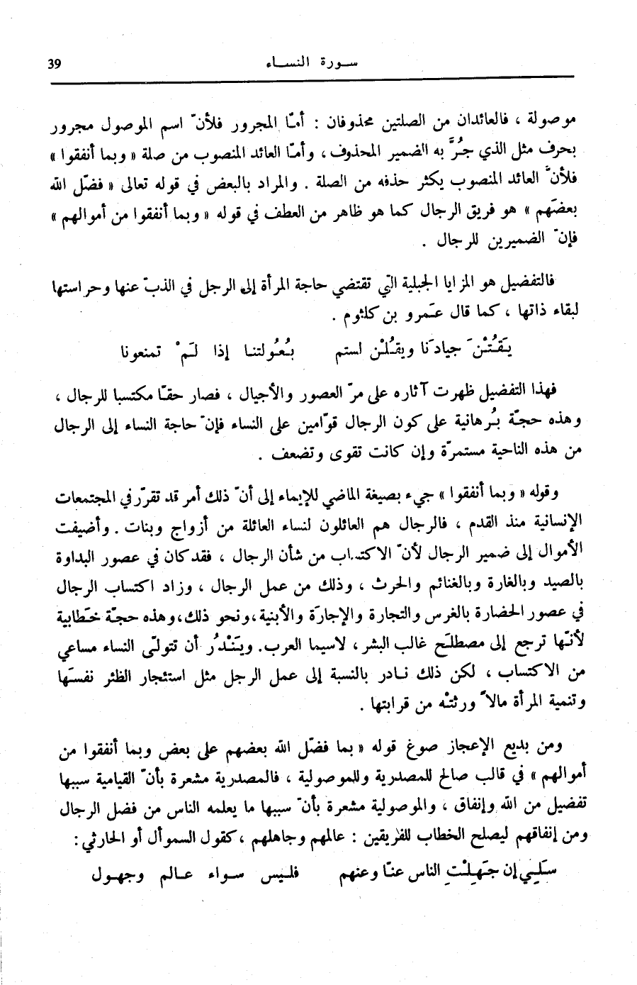 فَالتَّفْضِيلُ هُوَ الْمَزَايَا الْجِبِلِّيَّةُ الَّتِي تَقْتَضِي حَاجَةَ الْمَرْأَةِ إِلَى الرَّجُلِ فِي الذَّبِّ عَنْهَا وَحِرَاسَتِهَا لِبَقَاءِ ذَاتِهَا، كَمَا قَالَ عَمْرُو بْنُ كُلْثُومٍ: